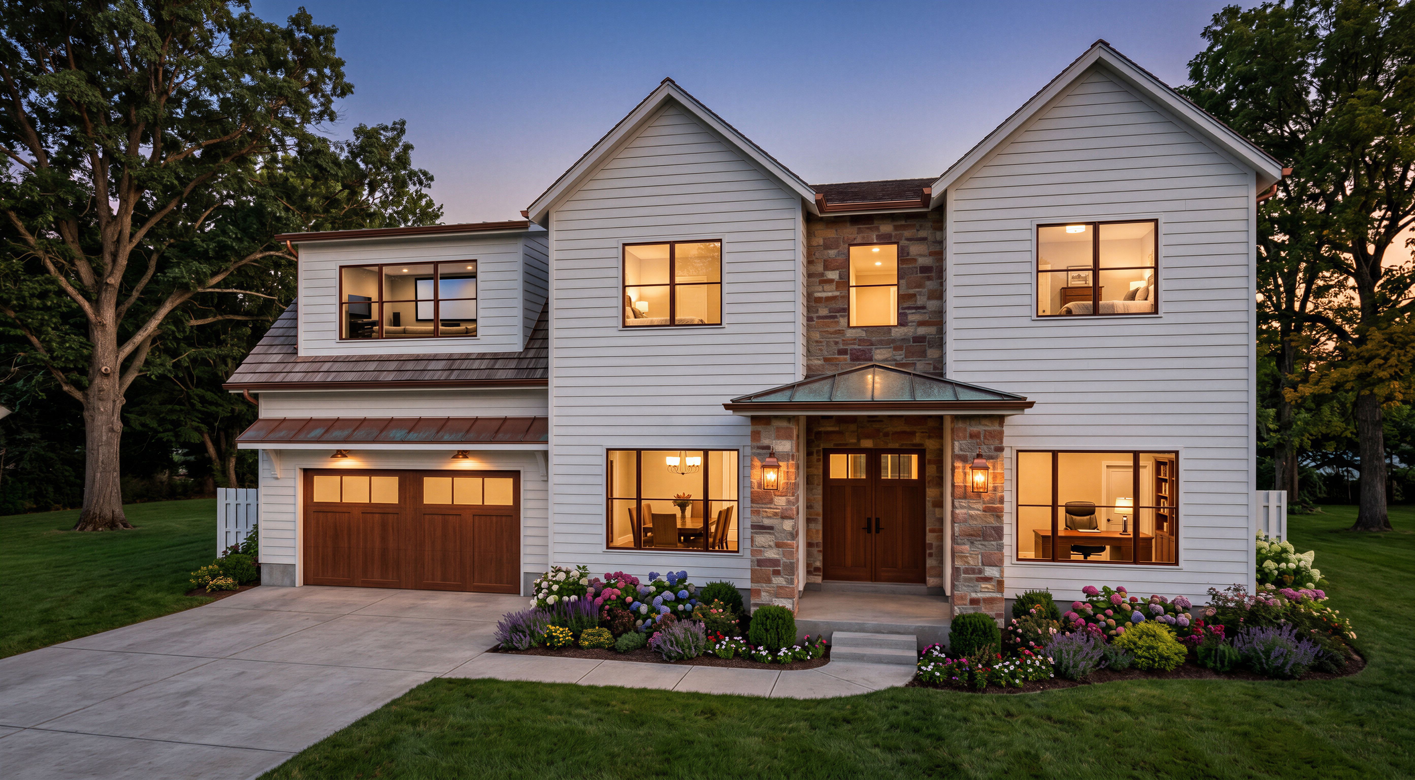EnhancedPromptMake photorealistic renderings of this house image; Grass in the front, light brown ground areas flanking the porch entry are flower beds; Trees on the left and right of the house in the background; Add exterior light fixtures where appropriate; Lights on in the interiors; Room to the right of the front porch is office; Room to the left of the front porch is dining; Room above the garage is media room; Two rooms with gable roof are bedrooms; Room directly above the porch entry leave empty, but lights on, keep exact camera angle