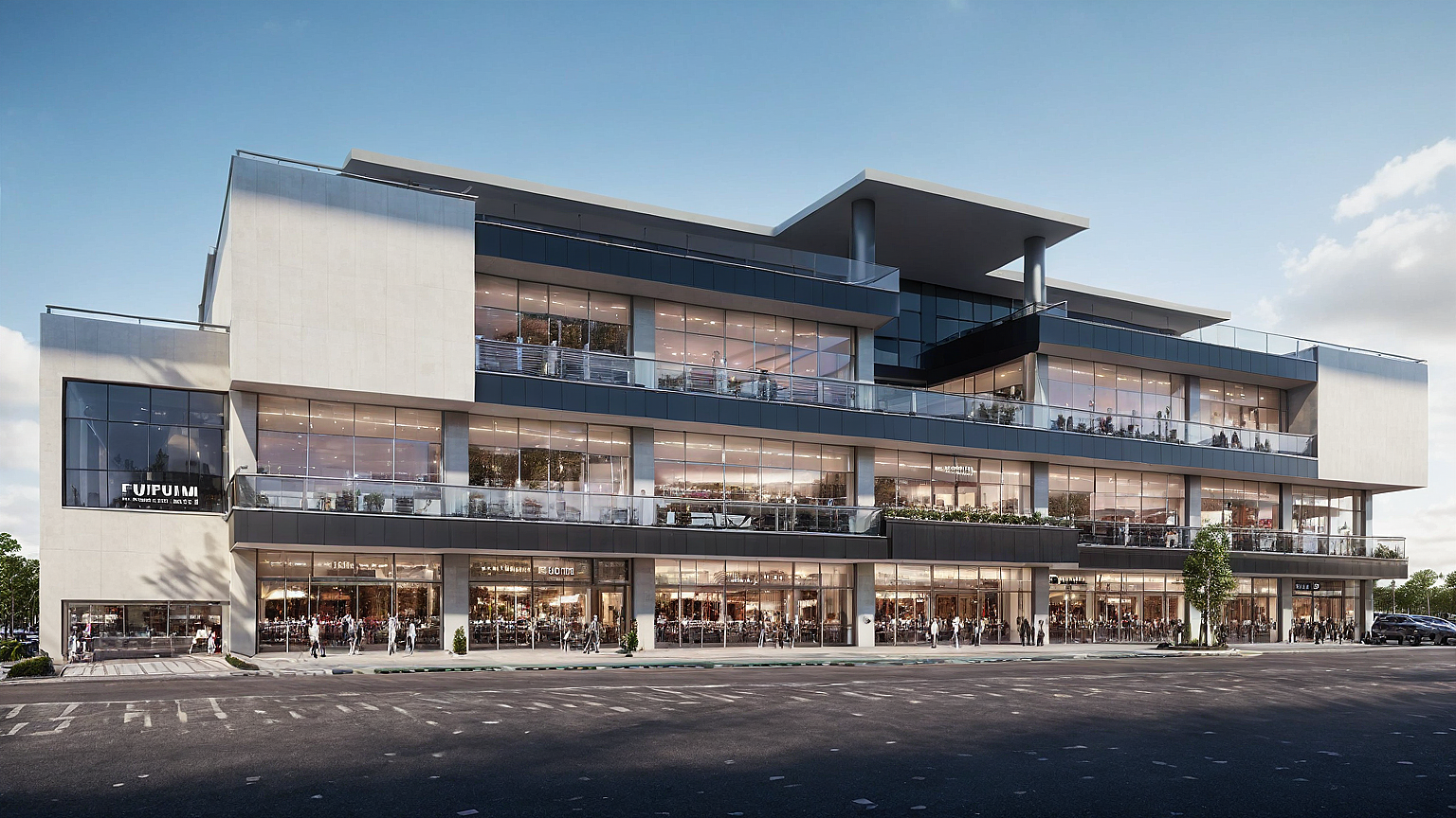 Promptshopping mall, cars, trees, people, realistic rendering, modern facade, realistic sky, parked cars, lighting on the facade, small trees in front of the building, people walking, cars passing by