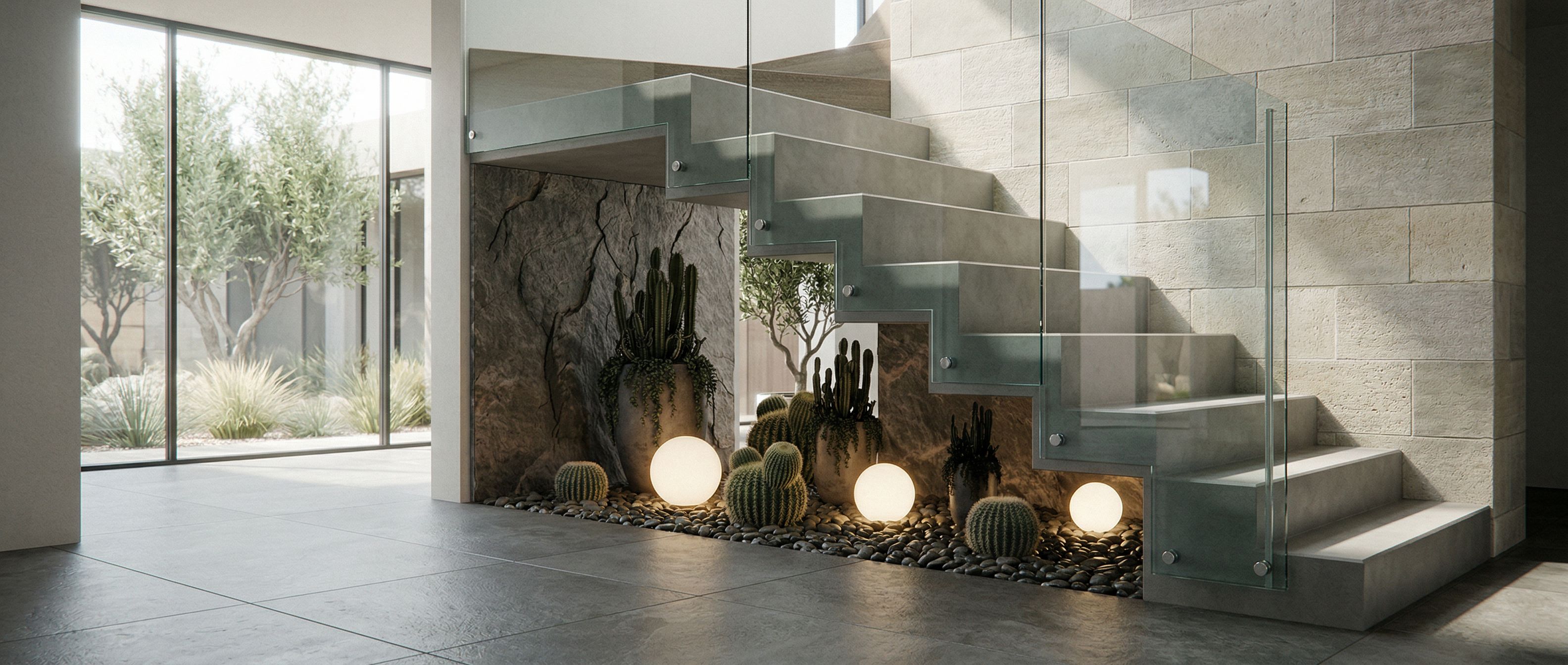 Photo of a modern interior staircase featuring a minimalist design, focusing on sleek lines and glass railings. Element details include textured stone walls and a decorative planter with cacti. Set in a bright, airy space with natural light pouring in, casting soft shadows. The perspective captures the stairs from a low angle, offering depth and showcasing the spaciousness of the room, with a wide-angle lens effect to emphasize the architectural elegance., keep exact camera angle