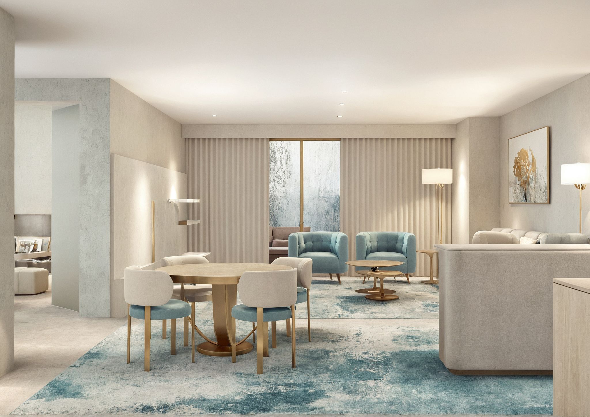 a sophisticated, multi-functional interior that combines a living area, bedroom, and workspace in a harmonious layout. Use an L-shaped beige sofa with teal cushions, a wood-and-bronze coffee table, and a soft abstract rug. Incorporate a king-sized cream upholstered bed flanked by ribbed glass and brass pendant lights, with curved nightstands and matching ottomans on a round neutral rug. Include a brass wall accent, full-height beige curtains, and soft textured walls. Add a wood-accented desk, vanity, and minimalist storage units. Define zones with a black-framed glass partition. The style is modern, elegant, and calm with art-deco touches and natural elements.