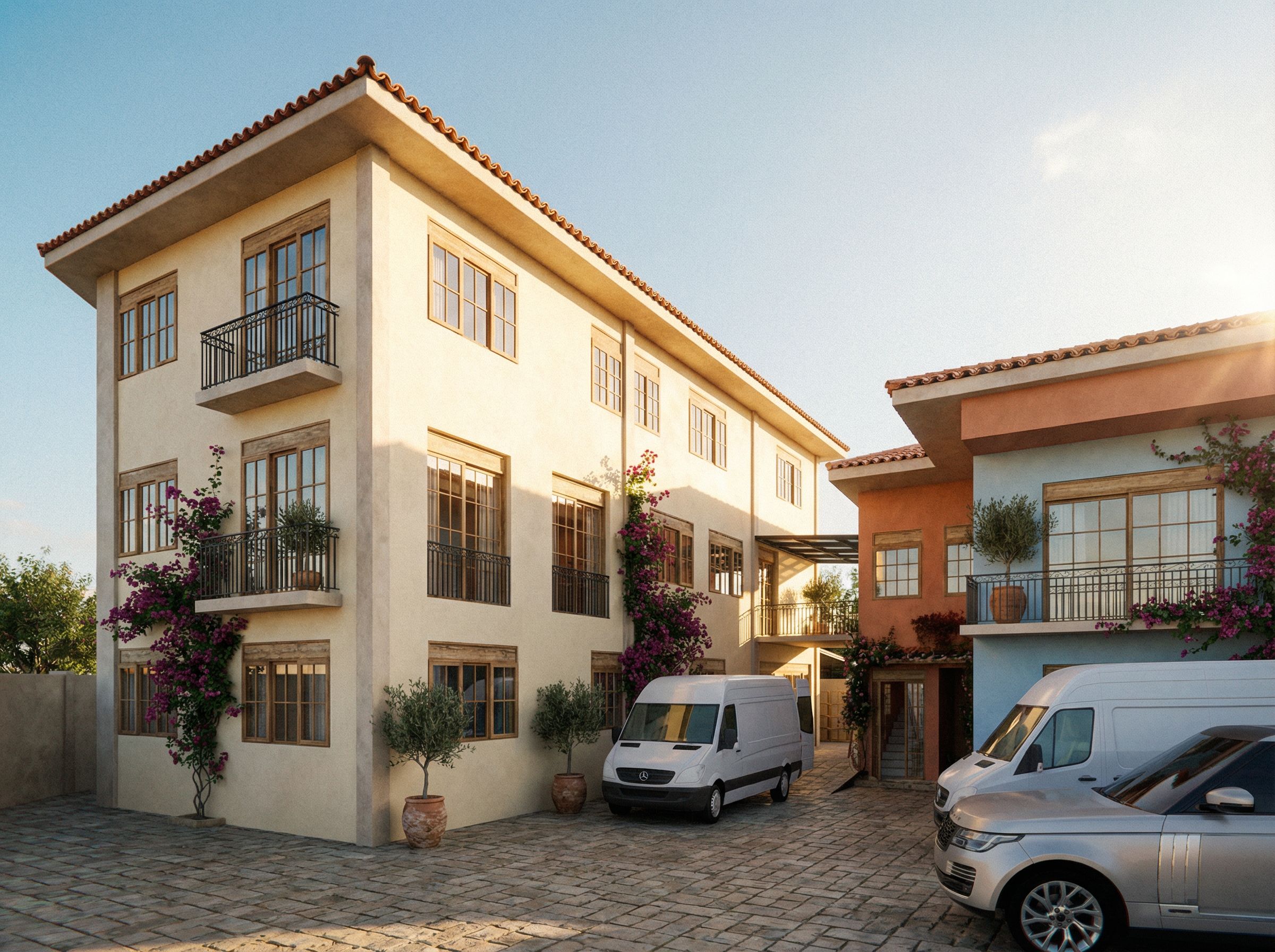 Promptcreative render building to give a mediterreaneann look, keep exact camera angle