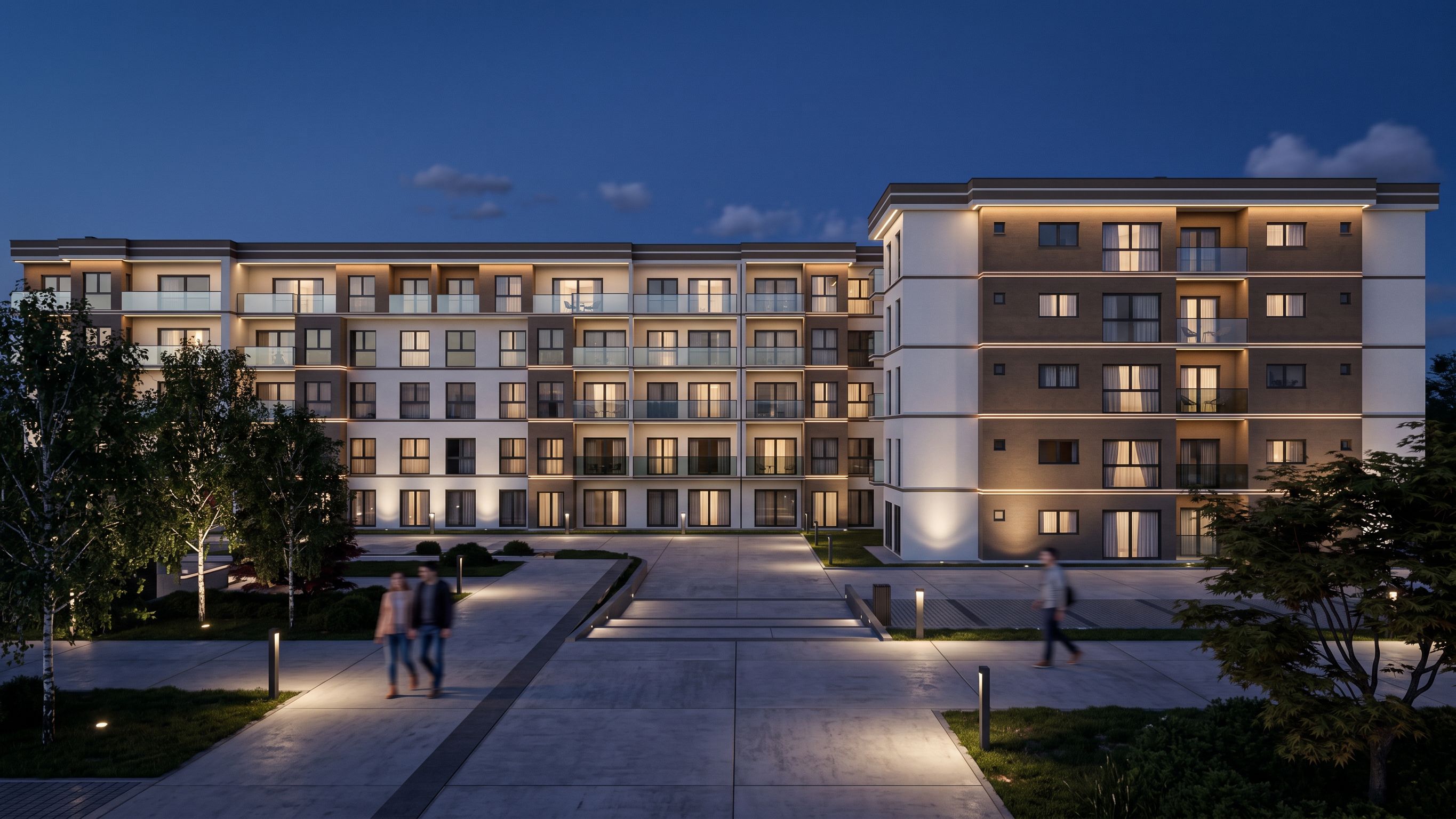 Photo of a modern multi-story residential building, featuring clean lines and contemporary finishes. The facade showcases a mix of textured materials, with striking brown and white contrasts. Surrounding the structure, a minimalist urban landscape with paved pathways and greenery adds context. Bright daylight illuminates the building, casting soft shadows that highlight architectural details. Captured from a frontal perspective using a wide-angle lens, emphasizing the building's height and the inviting balconies that extend outward, creating a seamless connection to the outside., keep exact camera angle