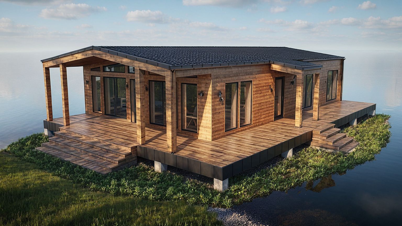 PromptA modern barnhouse with wooden planks. A forest and a lake in background.