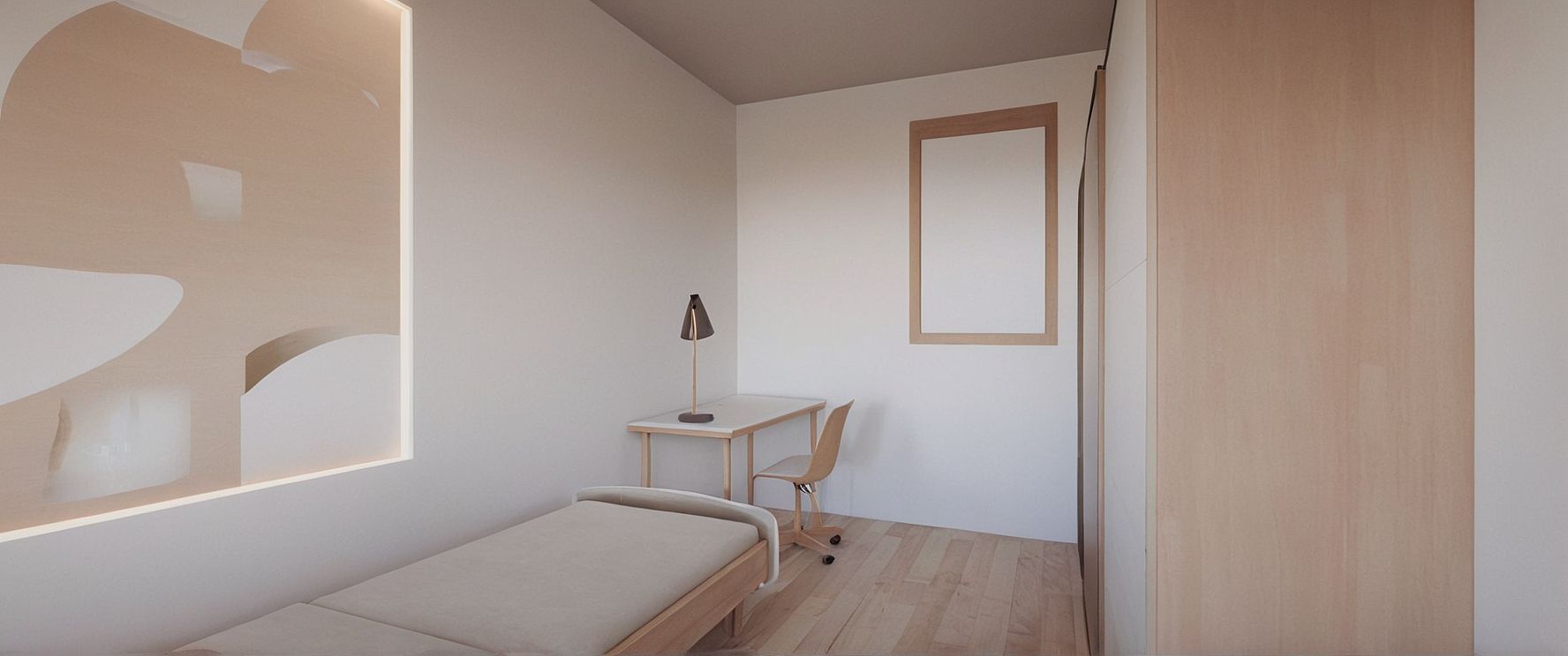 PromptPhoto of a minimalist bedroom featuring a simple layout with a bed, desk, and chair. Emphasize clean lines, white walls, and natural wood flooring. Highlight the sleek design of the desk lamp and modern furnishings. The room is illuminated by soft, diffused natural light from a window, casting gentle shadows across the space to enhance the tranquil atmosphere. Capture from a corner angle, showcasing the depth of the room, with a lens that provides a slight wide-angle view to encompass all elements harmoniously.