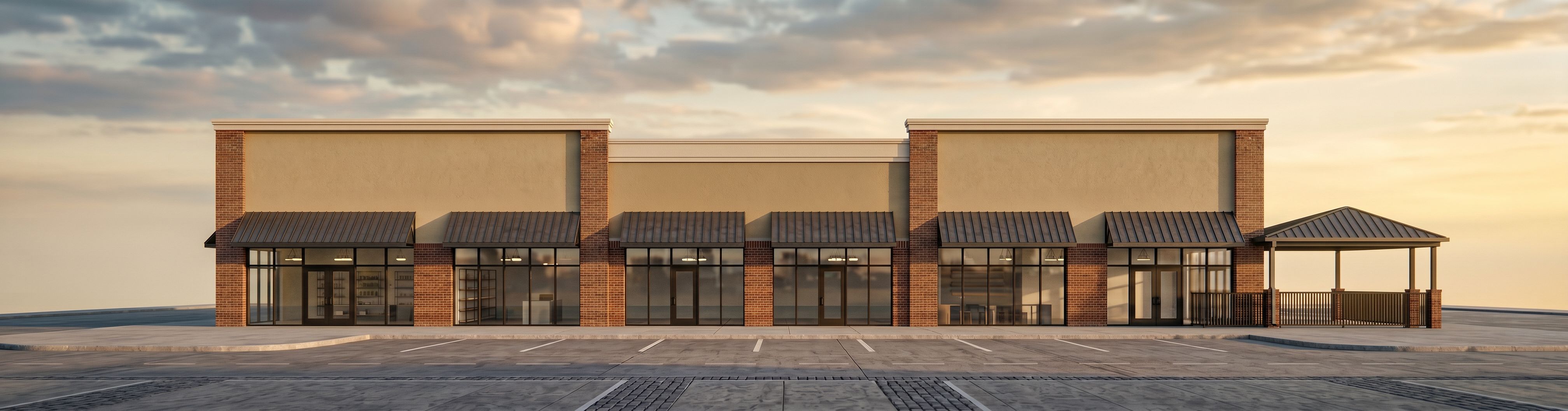 PromptRemove the city backdrop. Just show a sky as the backdrop, including on each end of the building. Remove the trees/landscaping from the front. Remove the M-1, EF-2 and EF-1 tags. Remove the metal roof drains, scuppers and downspouts from the front of the building., keep exact camera angle