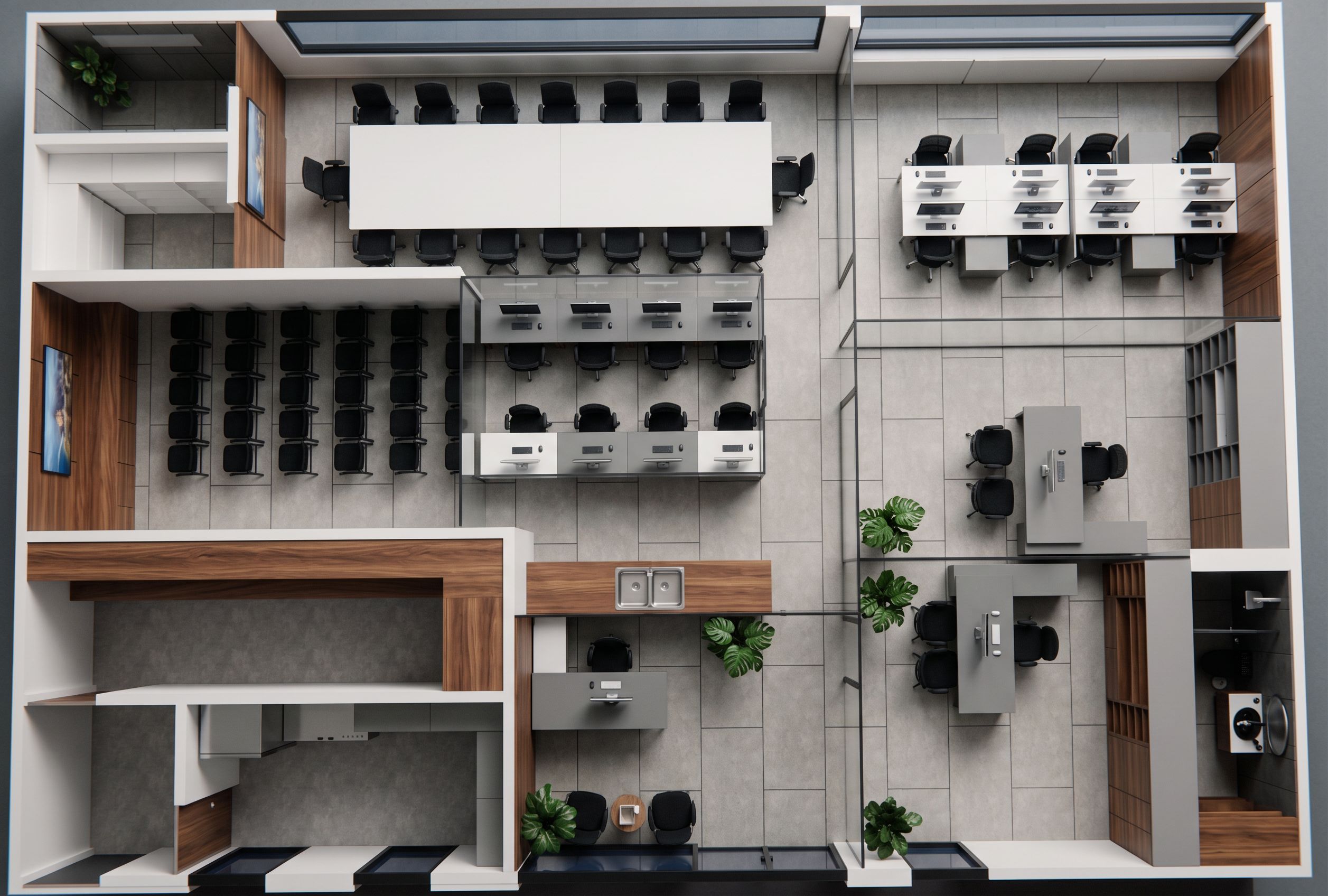 ayudame a hacer este render realista, esta todo al mismo nivel no puedes cambiar los colores de los materiales y mesas unas son blancas y otras grises no añadas luces led indirectas, no añadas detalles ni iluminacion, no cambies las mesas de colores, keep exact camera angle