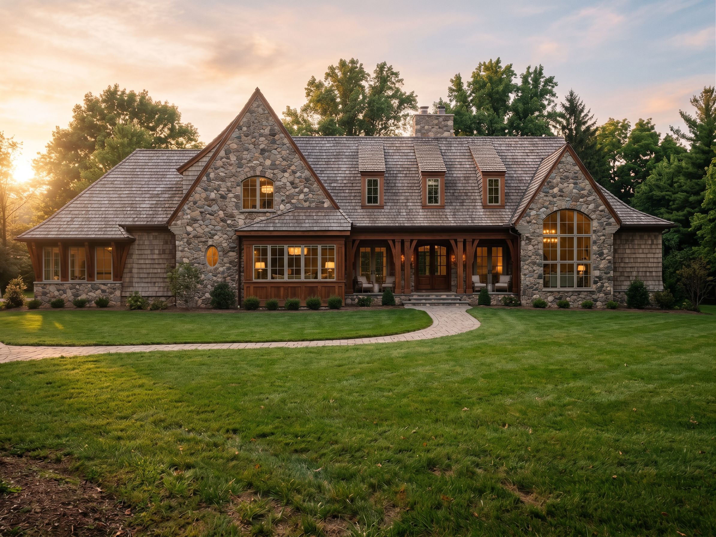 Photo of a contemporary stone-clad house, featuring a blend of textures with intricate wood detailing and expansive windows. Surrounded by lush green trees and a spacious lawn, the structure is set in a serene suburban environment. Soft, natural lighting during golden hour enhances the building’s features, casting gentle shadows. Captured from a low angle, providing a wide perspective that emphasizes the architectural elements and depth, using a 24mm lens to create a dynamic and inviting atmosphere.