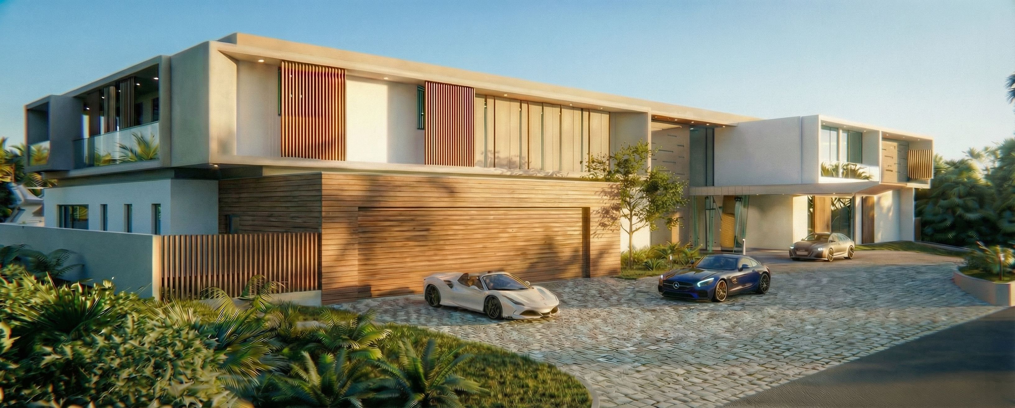 PromptAPLICAR LA MISMA DE LA MADERA DEL PORTON DEL GARAGE A LA PARED FRONTAL DEL GARAGE Y A LA PARED DE LA IZQUIERDA DEL GARAGE. SOLAMENTE A ESAS DOS PAREDES. LAS OTRAS PAREDES DEL PRIMER PISO DE LA IZQUIEDA DEBEN CONSERVAR EL COLOR ACTUAL., keep exact camera angle