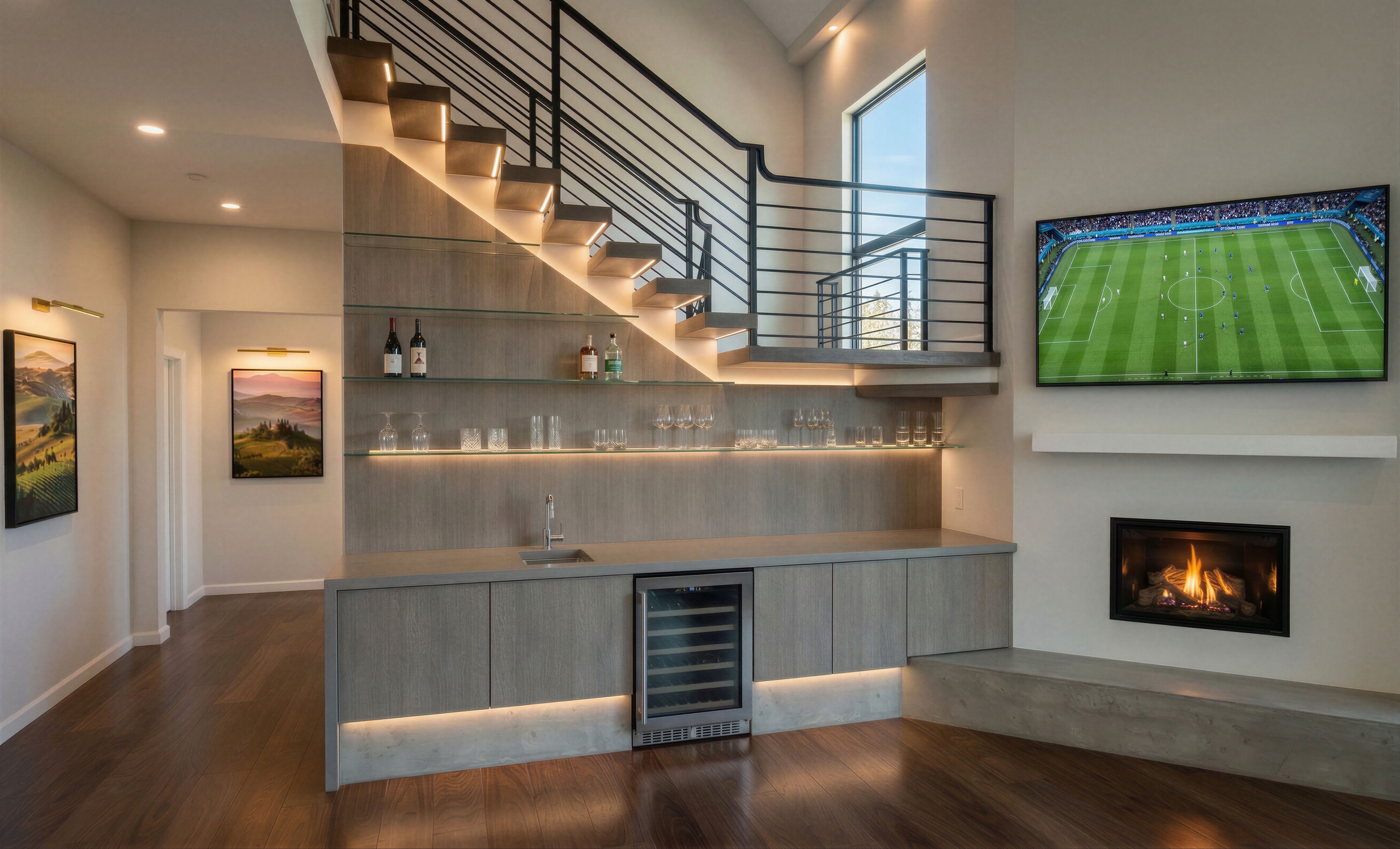 TV above the fireplace is showing soccer field with Italian soccer team playing, no zoom onto players, show just bird's eye view of the field, no game score do not add windows do not add windows do not add windows keep existing windows do not add doors keep existing doors, keep exact camera angle