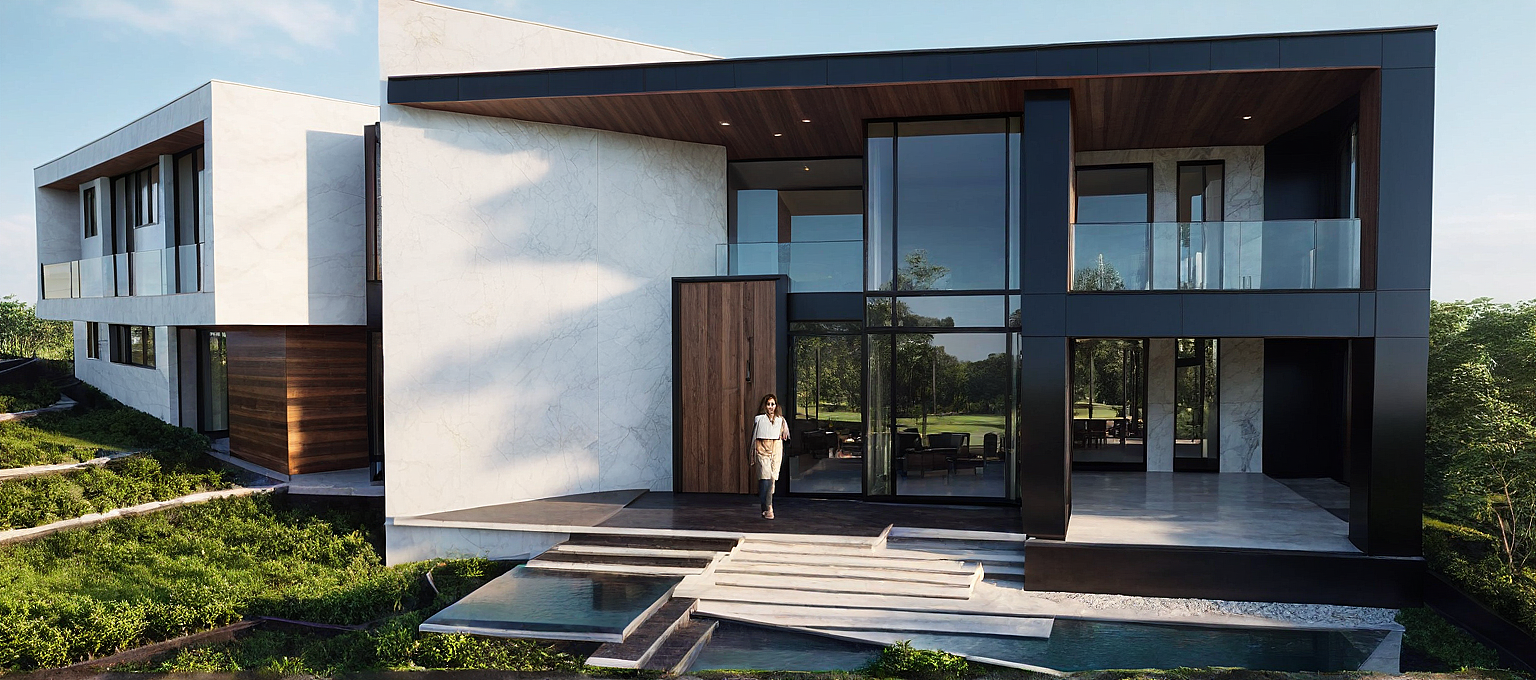 modern house facade, natural materials, abundant green landscaping, black window frames, glass railing, taj mahal marble wall, wood front door, sloped terrain