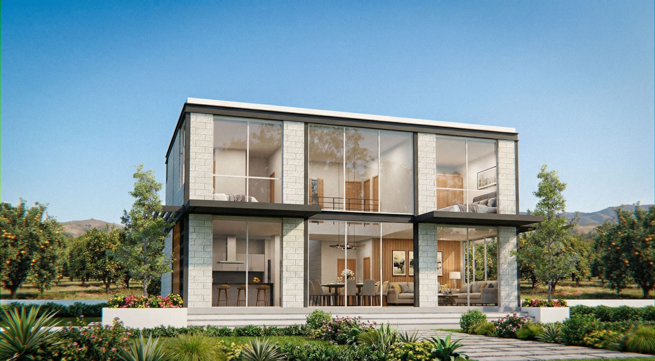 PromptPhotograph of a contemporary residential building with expansive glass walls reflecting the exterior and offering transparency, and a minimalist facade of white industrial brick. On the ground floor, to the right is a living room, the central area is a double-height dining room, and to the left are the kitchen bar and the entrance to the house. On the upper floor, to the right is one bedroom and to the left another. Highlight the elegant lines, the textures of the natural stone, and the integrated vegetation with planters of vibrant flowers. Located in a rural setting, with no other buildings nearby, the property features fruit trees in the background and a landscaped area in front.