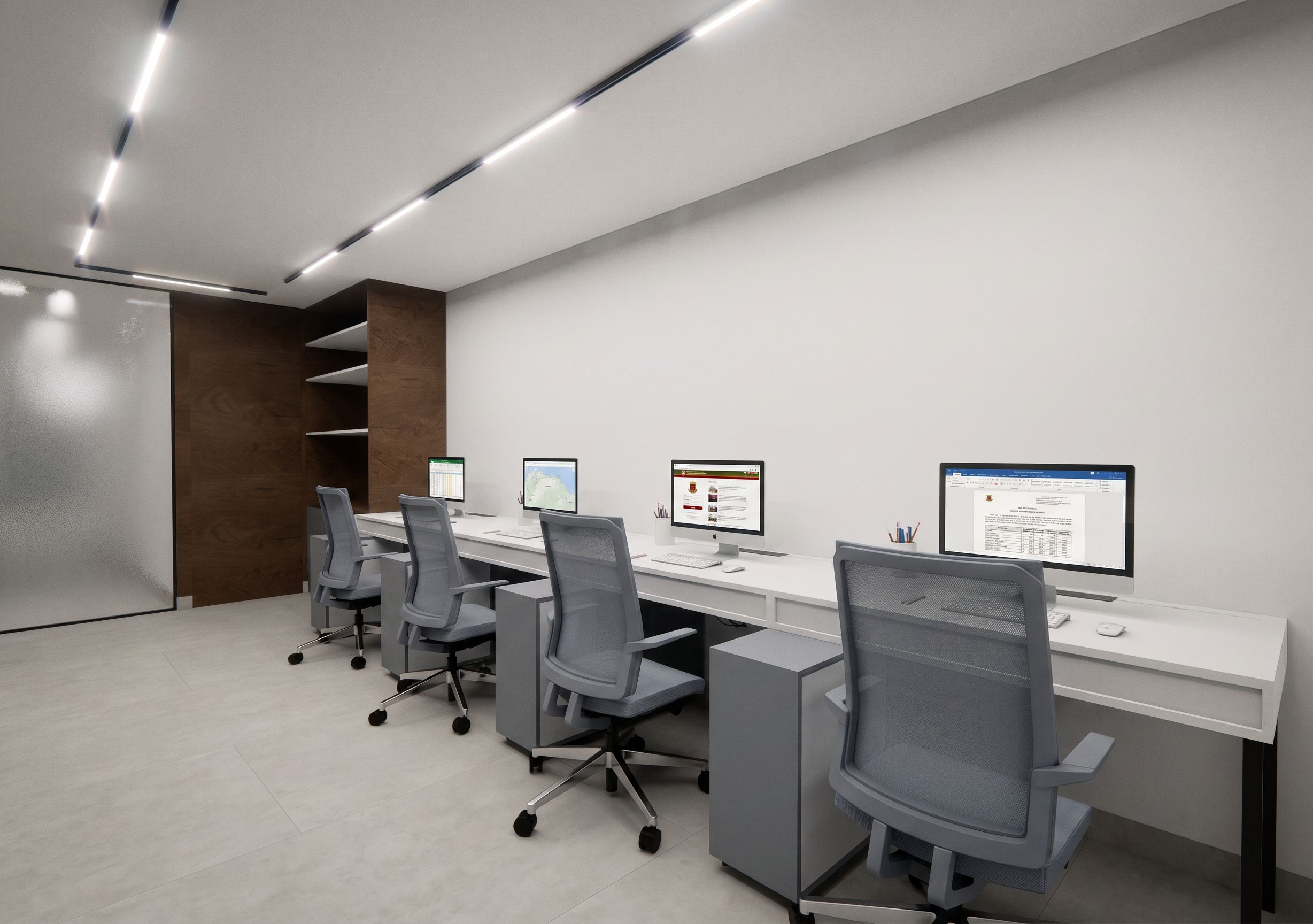 cambia las sillas a color gris, y añade el efecto de que los ordenadores estan encendidos NO MODIFIQUES NI CAMBIES MAS NADA ES UNA OFICINA DE LA GUARDIA NACIONAL BOLIVARIANA DE VENEZUELA , keep exact camera angle