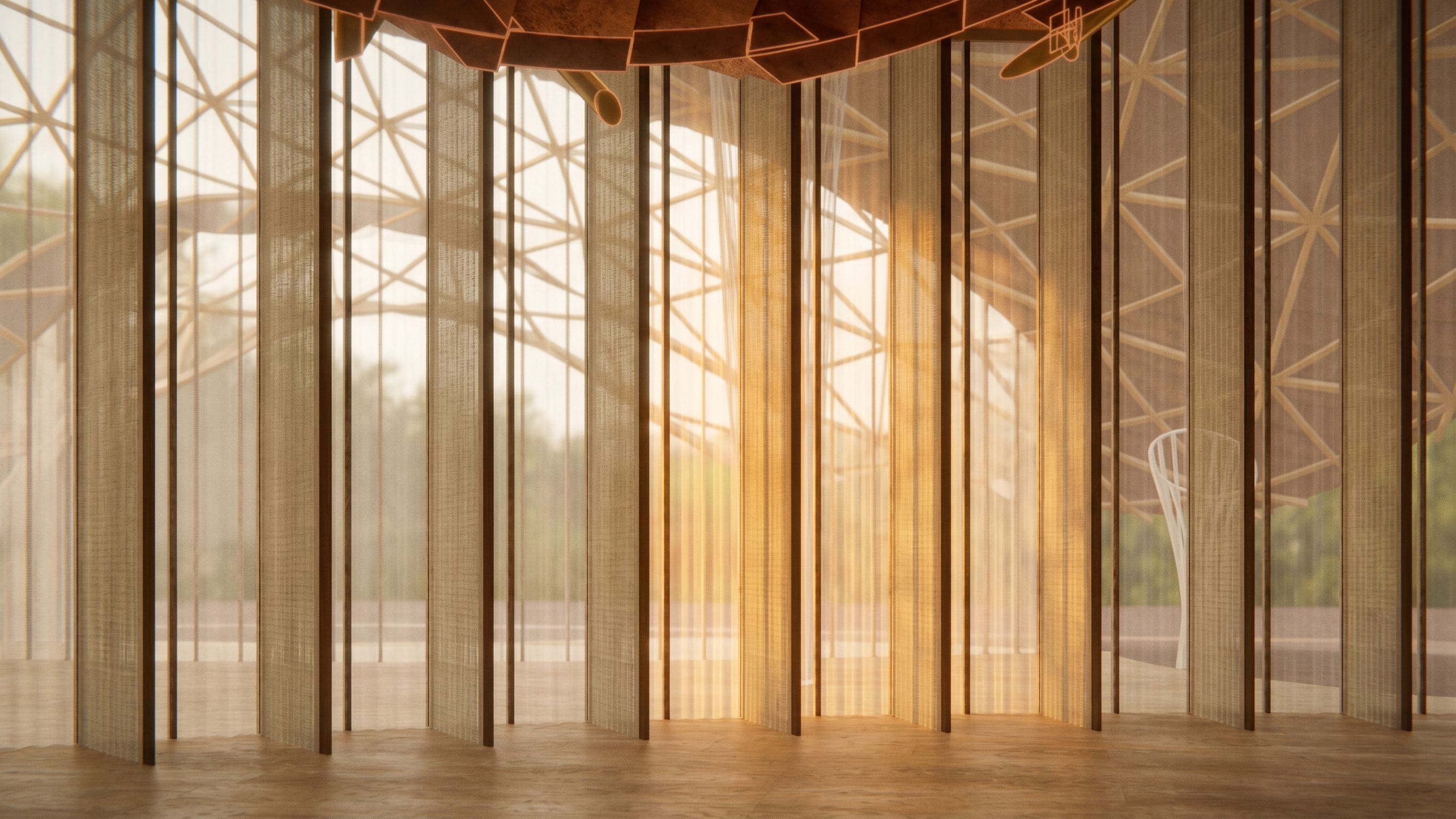 PromptTransform the provided architectural render while preserving the existing warm amber/yellow tone, material richness, and overall ambiance. Do not neutralize or cool down the color palette. Keep the current wood tones, curtain coloration, and golden atmosphere, but enhance the space with stronger backlit fabric glow and softer light diffusion inspired by the reference image. Refine the curtain materials to feel like layered sheer linen and gauze with visible woven texture, maintaining their current warm yellow-beige tone. Introduce slight irregularity in opacity so some panels appear denser and others more translucent, while keeping the overall richness and warmth already present. Adjust lighting to introduce more controlled backlighting from behind the curtains. Light should pass through the fabric and create a soft glowing effect, but remain grounded in the existing golden ambiance. Increase brightness selectively in certain क्षेत्रों behind the curtains to create depth and variation, rather than evenly lighting all panels. Soften shadow edges and introduce subtle light bloom around brighter مناطق, but avoid washing out the scene. Maintain contrast by keeping darker vertical elements and structural lines visible through the curtains. Preserve the current wood material quality and warm tones, but slightly soften edges and reduce harsh digital sharpness so the scene feels more atmospheric and cinematic. Add a very subtle haze and light film softness to enhance depth, but do not flatten the image or reduce clarity too much. The goal is a balance between softness and material presence. Keep exterior greenery visible but soft and slightly blurred through the curtains, maintaining the existing composition. Avoid overexposure, avoid turning fabrics white, avoid flattening depth, and avoid making the lighting uniform. Do not remove the warmth or golden tones. Prioritize enhancing backlit glow and soft diffusion while preserving the existing rich, warm material palette and atmosphere., keep exact camera angle
