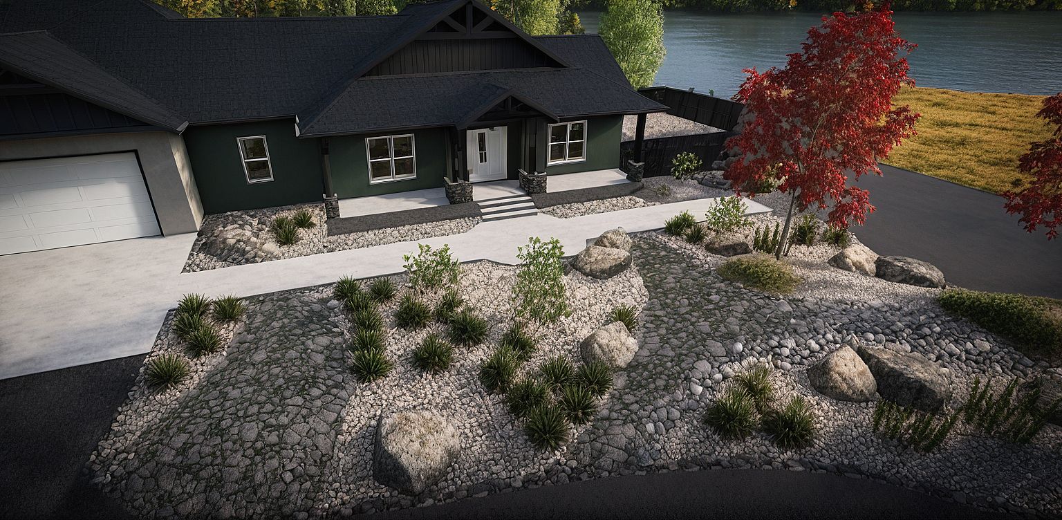 Promptdark green stucco house, black roof, white trim, white garage door, concrete walkway, river rock, dark rock paths, red maples, sandy terrain