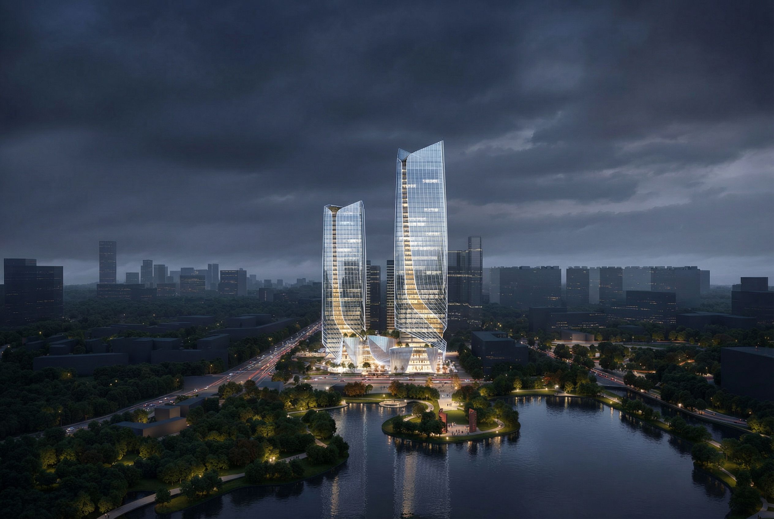 Promptarchitectural exterior rendering, render this 3D mass into photorealistic rendering, Optimize this night scene rendering with high-quality glass texture without changing the perspective, keep exact camera angle, including people, vehicles, greenery and vegetation, trees, street furniture, high quality, professional, detailed scene