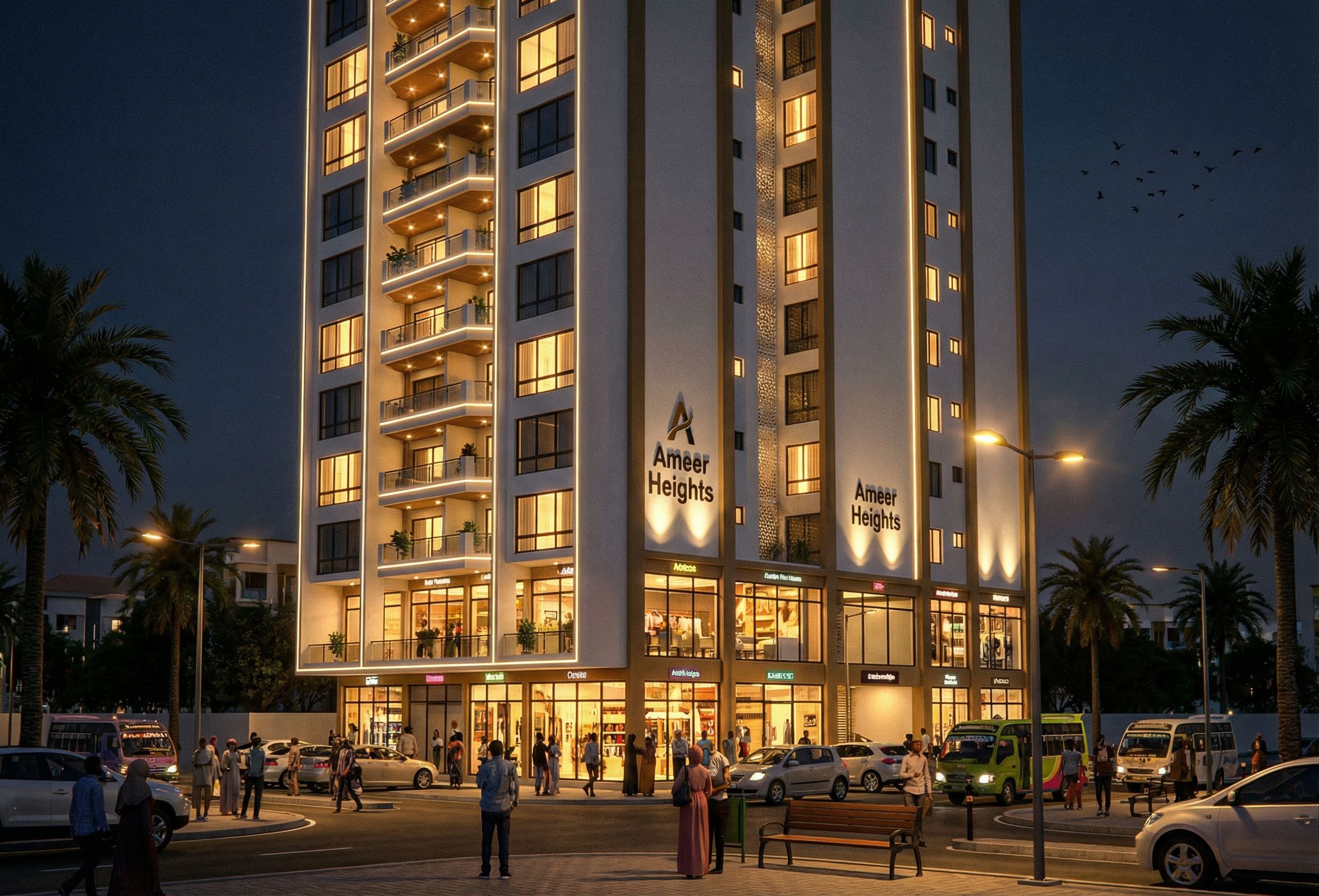 Perspective of a 14 storey building with ground and first floors as commercial spaces and second to fourteenth floors as apartments. Turn on the lights in the building. Use spot lights and rope lights in the building and introduce street lights.Use white wall master on the building and introduce people of Somali and African origin on the street. Introduce some birds in the sky and the environment a commercial building in NAIROBI South C area. Use palm trees as landscaping. Introduce graphics ' Ameer Heights" on the building. , keep exact camera angle