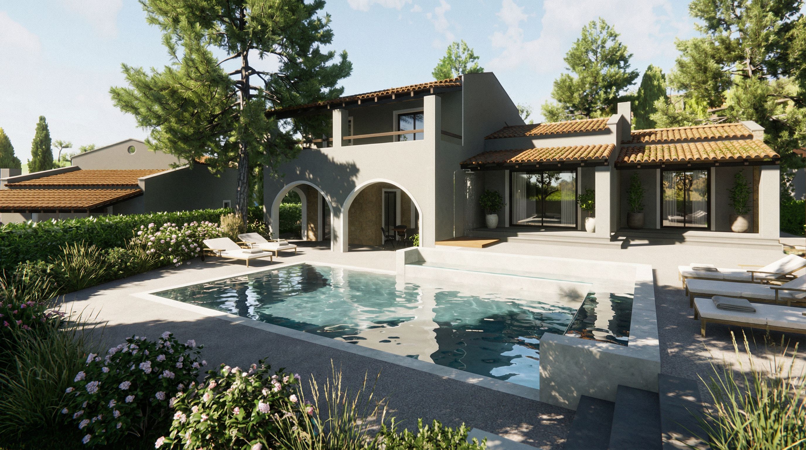 Photo of a contemporary residential villa featuring a stylish design with smooth gray walls and decorative arches. The building showcases a combination of rustic terracotta roofing and expansive glass windows, enhancing its modern aesthetic. Set within a lush landscape, the villa is surrounded by tall pine trees and manicured hedges. Bright, natural daylight illuminates the scene, casting soft shadows across the poolside. Captured from a slightly elevated angle with a wide lens, emphasizing the structure's integration with its outdoor space while highlighting the serene ambiance of the swimming pool area. Do it more realistic, keep exact camera angle