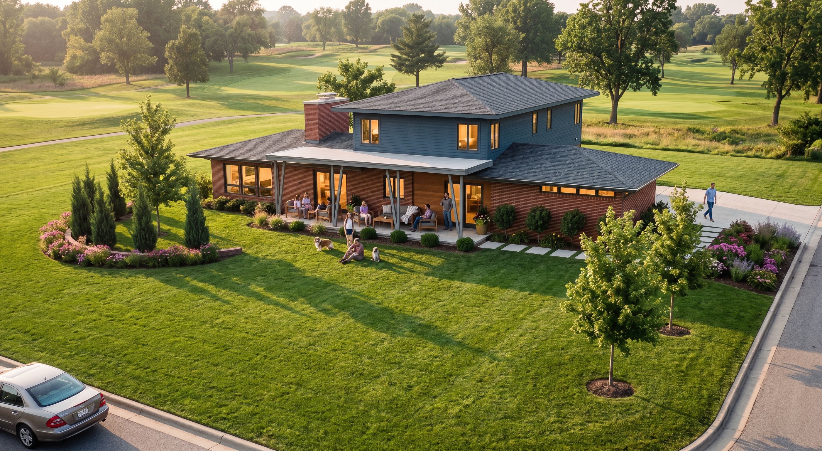 Photo of a contemporary single-family home nestled in a lush, blue lap siding with norman brick type, green landscape. Highlight the warm wooden elements, clean lines, and modern textures. The inviting porch features stylish outdoor seating surrounded by carefully manicured gardens and native trees. Natural sunlight casts soft shadows, creating a serene atmosphere during golden hour. Capture the scene from a slightly elevated angle, using a wide-angle lens to encompass both the home and its vibrant surroundings, enhancing the spacious feel of the property. Asphalt shingle grey roof. Metal V colums grey, golf coarse, with no homes in background behind houses. add interior lighting and girls and boys , keep exact camera angle