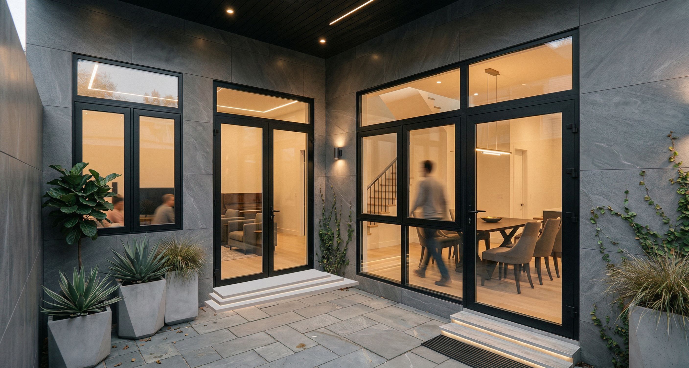 This photograph captures the entrance to a modern home, with sleek glass doors framed in dark metal, harmonizing with the rough gray stone walls. Three steps lead into the house, illuminated by spotlights at the base of the stairs. Modern planters with lush greenery surround the entrance. The interior is highlighted by warm, inviting lighting, emphasizing the wood details and minimalist furniture. Late afternoon light creates soft shadows, accentuating the architectural details. The low angle with a wide-angle lens emphasizes the grandeur of the entrance and the surrounding scenery, creating a vibrant and captivating glimpse into modern living., keep exact camera angle