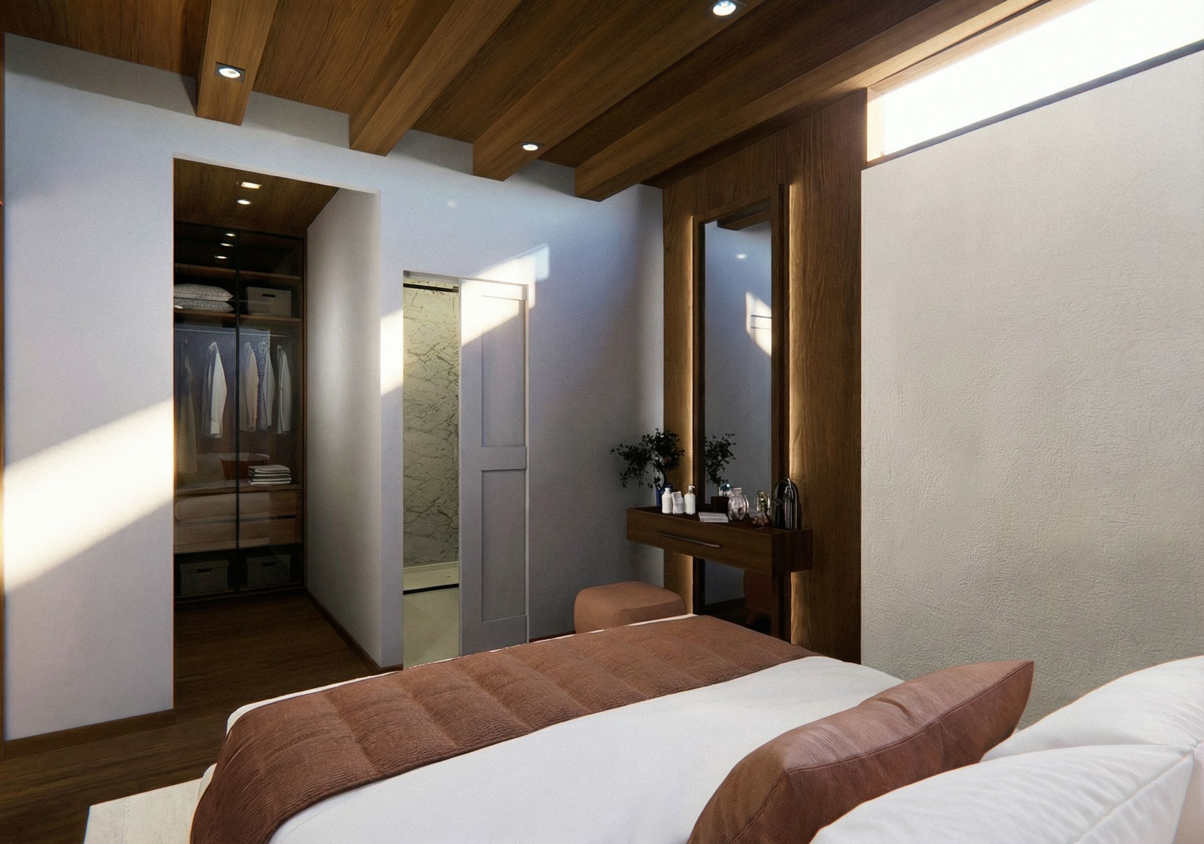 Ultra-realistic interior render of a bedroom. Preserve the exact furniture layout and design without any changes. Apply realistic natural sunlight streaming through the windows, with soft shadows to enhance depth and atmosphere. Use high-quality material textures for wood, fabric, and glass. Enhance details, reflections, and materials while keeping the scene exactly as it is. Photorealistic, high-resolution, cinematic lighting.”, keep exact camera angle