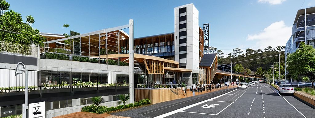 Prompt the new development is an expansion on what is already a pedestrian passover between the two Boondall train station platforms. included in the current passover is stairways and an elevator on each platform. my design idea is to build off this, and have an above-ground and over the train line, transverse design corridor, highlighting the connection between the two sides outside of the train station split by the dividing train line. in the building, lining the corridor (take inspiration from brisbane central train station, and brisbane's fortitude valley station, and have a cafe, restaurant, bathroom, grocer, atms, and seating available and lining the corridor.