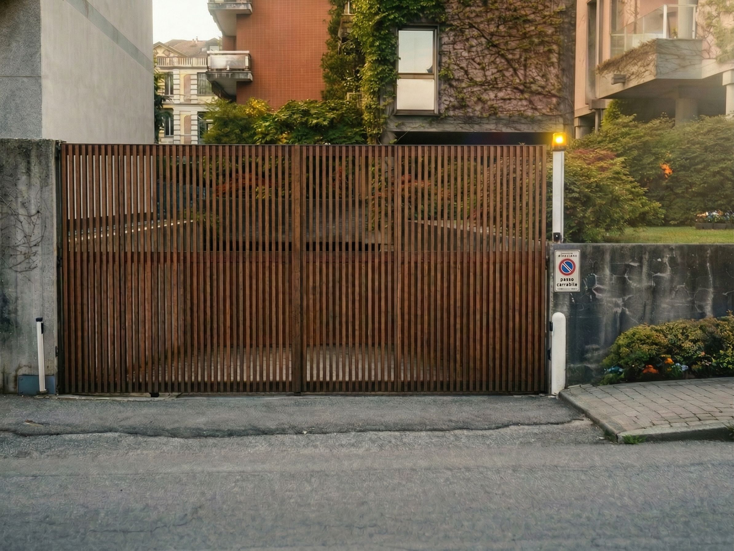 PromptRealizza il cancello dell'immagine circa il doppio in altezza fino a filo del muro sulla sinistra guardando il cancello dall'esterno, keep exact camera angle