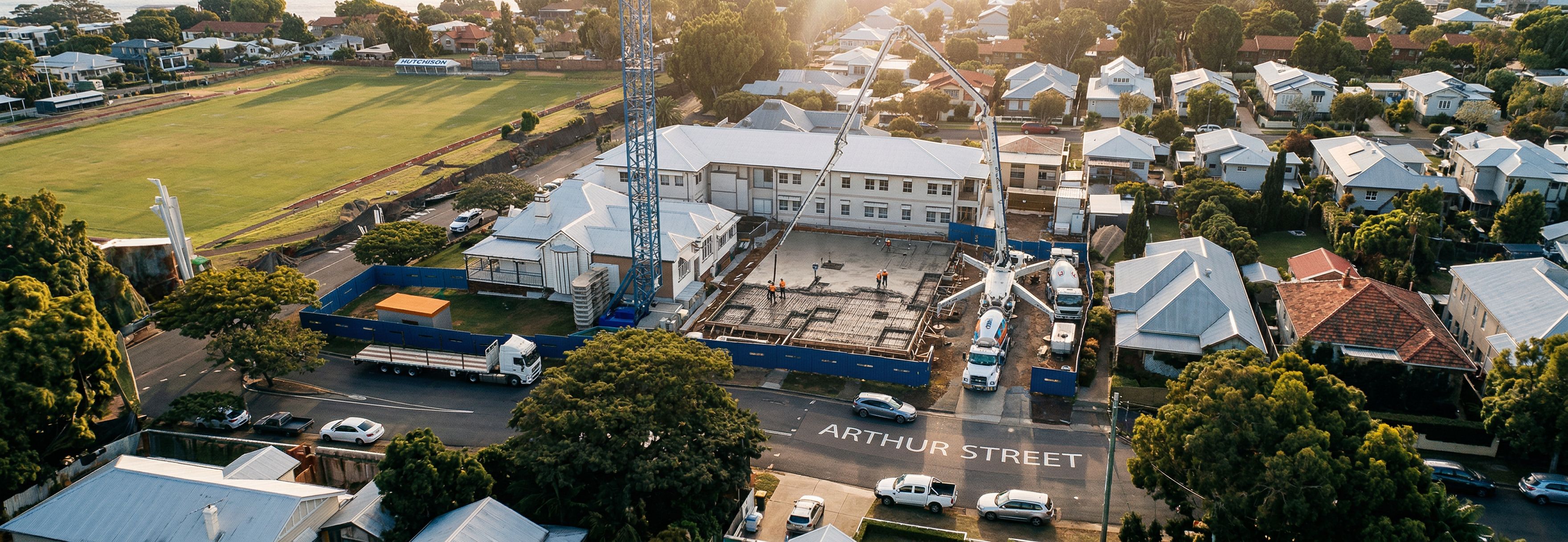 Photo of a construction site featuring an existing multi-story building at the back of the site outside the area of works, a heritage listed home to the left of the site and a new building foundations and slab being poured on the right hand side of the site within the fenced area. do not change any elements, buildings or add buildings, render as they are shown with crane and worksite. render Urban setting includes residential houses nearby and a sports field in the background, surrounded by trees. Natural lighting during late afternoon, casting soft shadows across the structure. Perspective is from an elevated angle, capturing the building's scale and its placement within the neighborhood. Lens specification suggests a wide-angle view to enhance the spatial context and foreground activity., keep exact camera angle