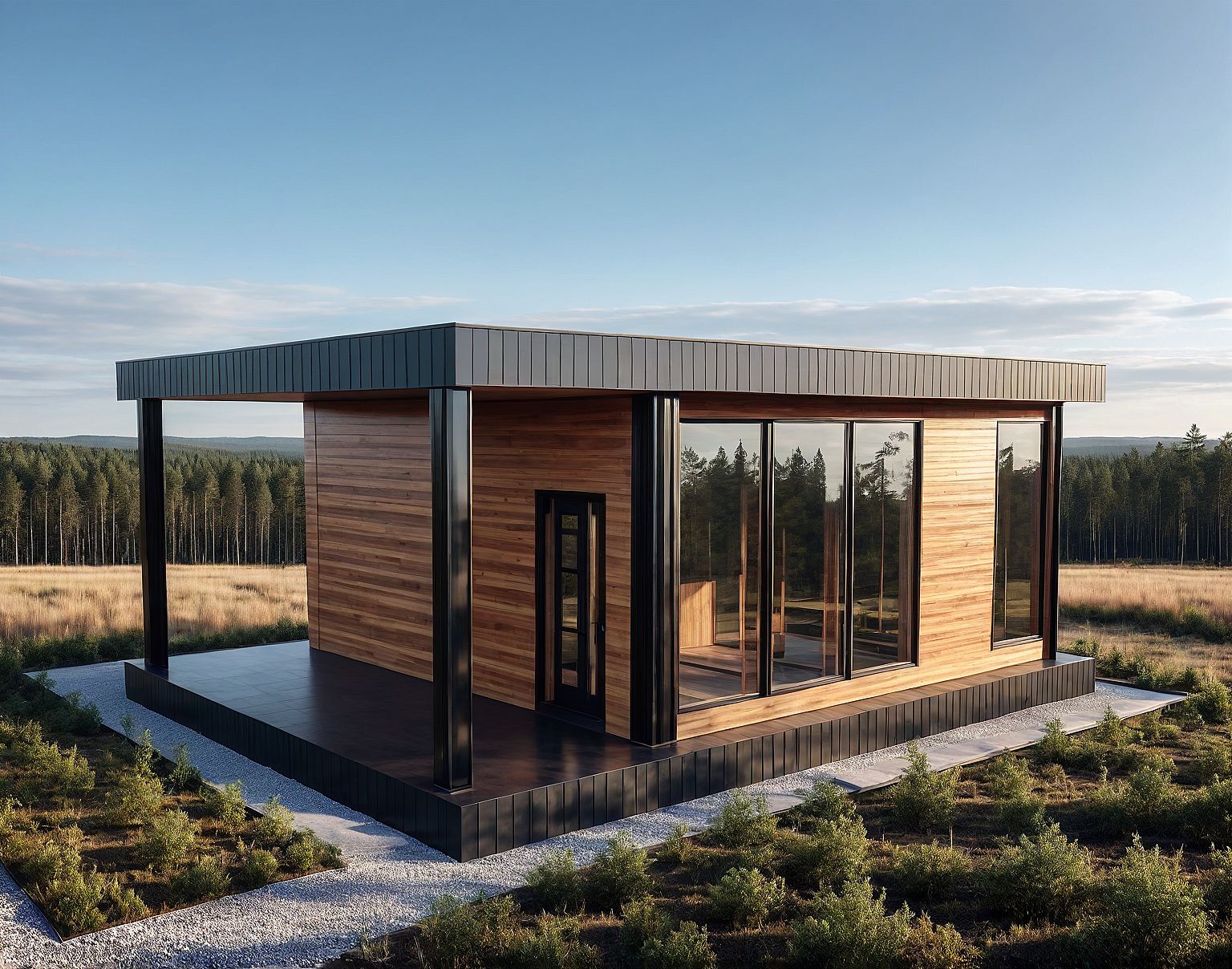 PromptModern minimalist house, wooden panels, glass windows, straight lines, geometric shapes, iron sheets and wooden planks, surrounded by forest.