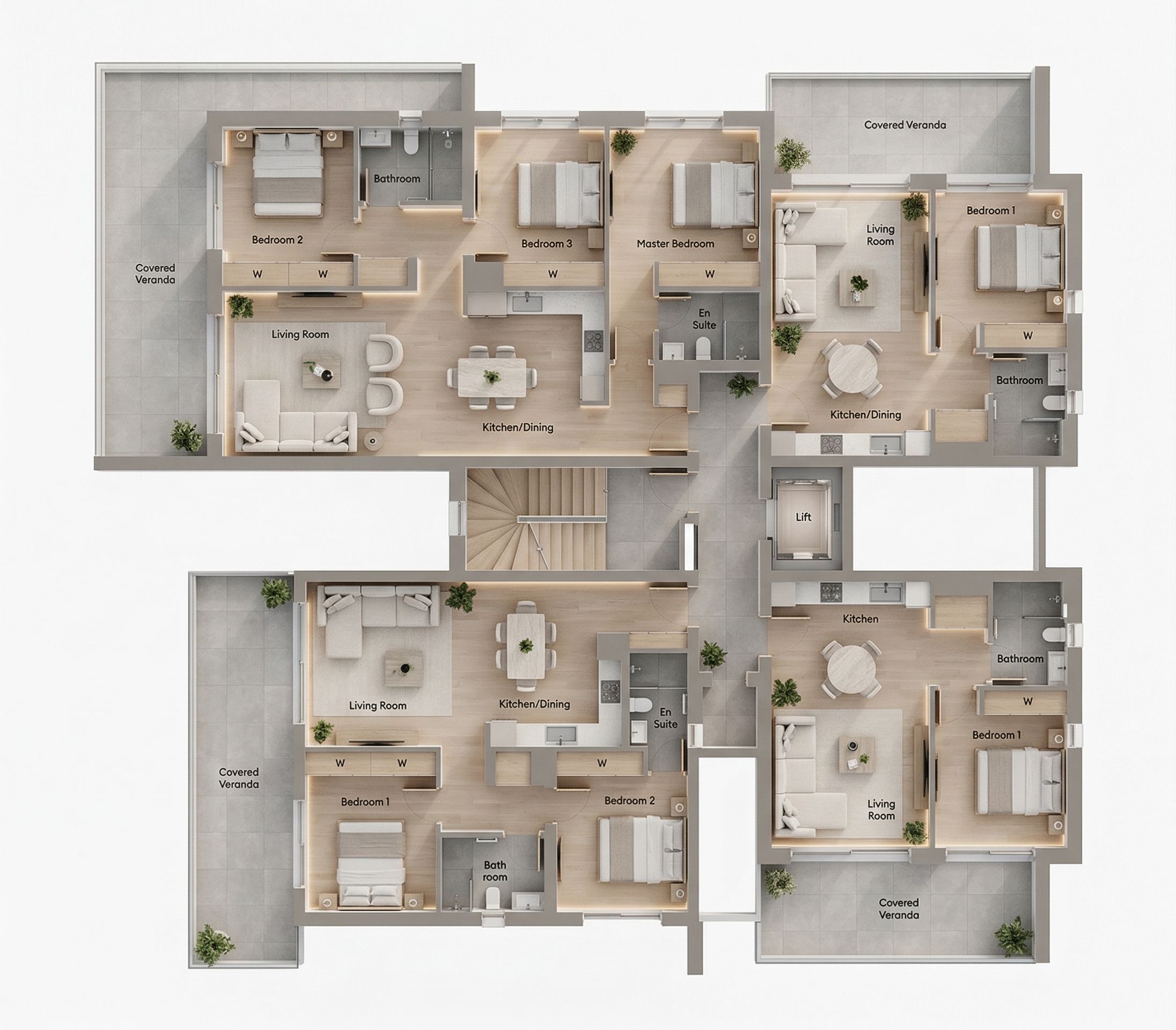 Highly photorealistic architectural render of a residential building interior, top-down view preserving exact floor plan layout, room proportions, walls, doors, and furniture placement as shown in the base floor plan image. Use materials: light neutral seamless wood flooring (beige/warm brown) for living areas, ceramic grey flooring for bathrooms, verandas and common areas, soft white walls with muted grey and soft brown accent tones, light natural oak wood millwork and doors. Lighting with warm, soft, diffused ceiling lighting, natural daylight from windows. Clean, calming, contemporary furniture. Include subtle biophilic touches like small green plants only where indicated. Maintain the top-down architectural visualization perspective. Do not alter floor plan geometry, do not move walls or doors, do not add or remove furniture. , keep exact camera angle