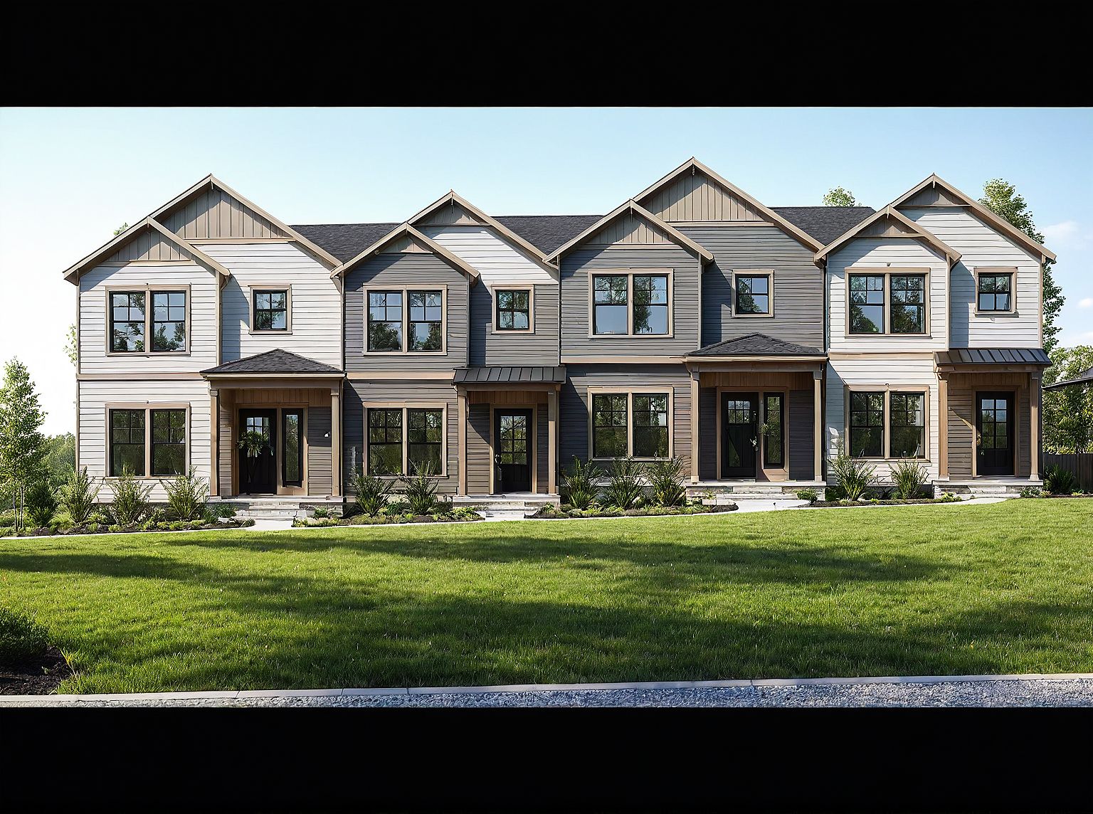 Photo of a row of modern townhouses with a blend of architectural styles, featuring gabled roofs, large windows, and welcoming front porches. The design incorporates smooth siding and stone accents, creating a harmonious texture. Surrounded by a lush green landscape, these homes offer a balanced urban living experience. Dappled sunlight casts intricate shadows across the facade, enhancing the structure's visual appeal. Captured from a slightly elevated angle, the perspective allows for a clear view of the front entrances while emphasizing the expansive lawn and nearby trees, evoking a sense of community. Generate with real cars and landscaping.