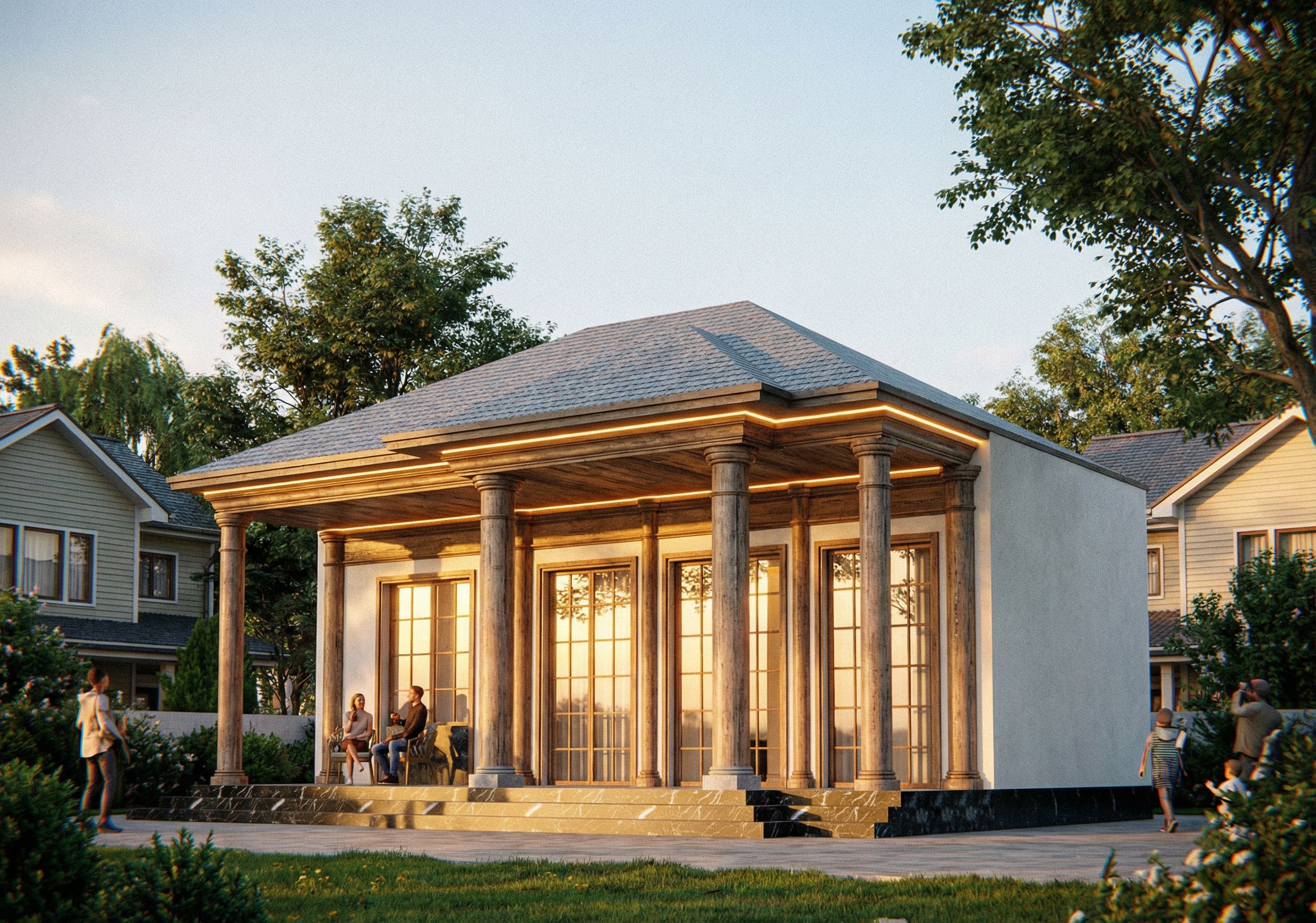 The photograph depicts a classic single-story house with wooden columns and a sloping gray tiled roof. The wooden frame is simply decorated with square elements, and the windows feature large wooden panels with glass panes. Surrounded by a minimalist setting, the house stands out with black stone accents at the base of the walls. The steps are paved with cream-gray marble with veins, and LED lighting is installed under the roof. The house is bordered on both sides by neighboring properties. It is illuminated by soft natural light, highlighting the texture of the materials. Maintaining the original design angle, the camera focuses on the entrance, main hall, and the entire house. A wide-angle lens is used to capture the entire facade, creating a vibrant image that emphasizes depth and detail. The entire architectural form and lines of the uploaded image are preserved.