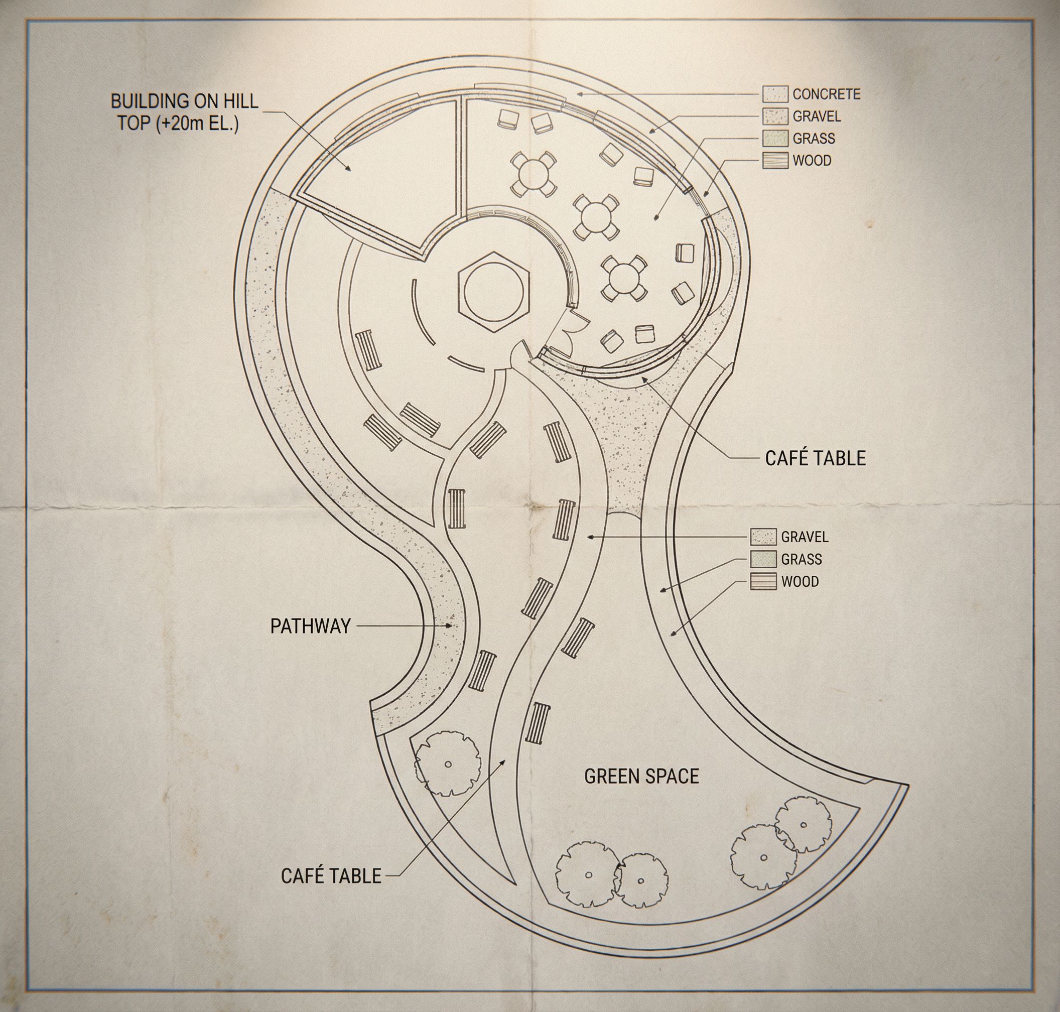 Enhance the existing site without changing or redesigning the current site plan, layout, geometry, or design logic. All existing boundaries, paths, circulation lines, levels, and spatial relationships must remain exactly as they are. The site has a gradual and continuous slope that gently rises toward an elevation of +20 meters. This slope must be fully respected and preserved, with no regrading or modification of the existing topography. Fill all unused and empty areas with green grass and simple landscape surfaces that follow the existing slope naturally. Maintain the current path alignments and geometry; improve their usability only through surface definition and detailing, transforming them into pedestrian walkways without altering their direction or shape. Introduce stair steps only where the natural slope requires it, carefully integrated into the existing paths and following the gradual elevation change, without flattening or cutting the terrain. Add benches along the walkways at logical resting points, especially where elevation changes occur, aligned with the existing circulation system. Surround the site with asphalt roads and nearby urban buildings strictly as contextual elements, reinforcing the site’s urban setting without affecting the internal site layout. Within the site, place café seating areas with tables and chairs, kiosks, stalls, and cultural booths inside the existing open spaces, ensuring all elements adapt to the sloped terrain. All new elements must be created as Revit-compatible components Floors, Model Lines, Site Components, or Families, properly categorized and leveled, and suitable for direct use in Autodesk Revit. while fully preserving the original site plan and smoothly responding to the gradual slope up to +20 meters THIS IS THE MOST IMPORTANT THING THE BUILDING SHOULD BE +20 M HIGHER THEN STREET. BUILDING SHOULD BE ON TOP OF THE HILLS
