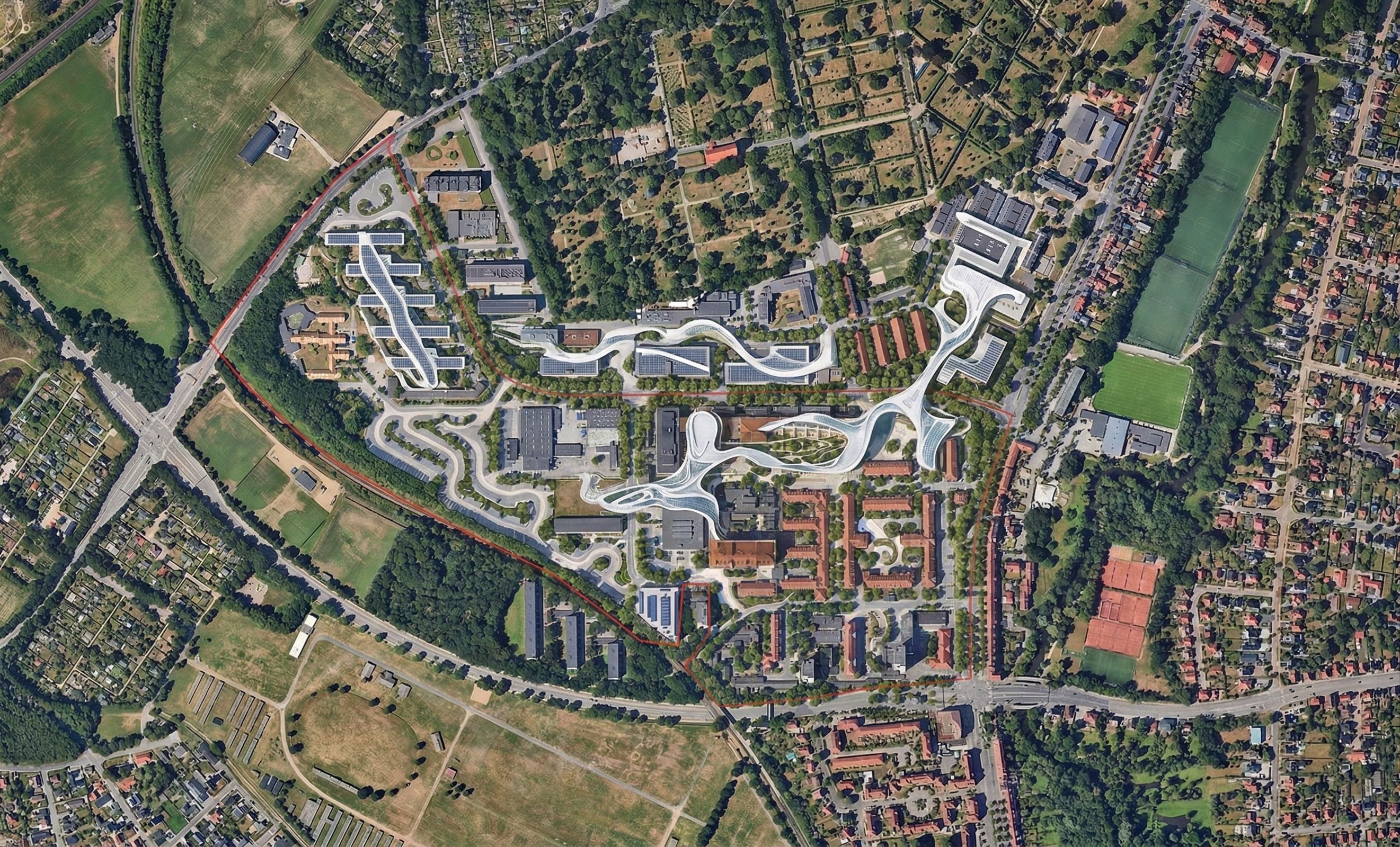 PromptCREATE A MASTERPLAN FOR THIS AREA, MARKED BY THE RED LINE. INSERT URBAN ELEMENTS IN LINE WITH URBAN REGENERATION AND ENVIRONMENTAL REDEVELOPMENT POLICIES. INSERT AND ENHANCE THE ROADS WITH GREEN AXES WITH NEW TREES; INSERT ERGONOMIC CONNECTIONS BETWEEN THE ROAD LEVEL AND SOME BUILDING ROOFS, IN AN ERGONOMIC STYLE, SUCH AS THE WHITE GLASS STRUCTURES IN "REFERENCE IMAGE 1" AND "REFERENCE IMAGE 2". CREATE OUTDOOR SQUARES WHERE THERE IS THE POSSIBILITY OF DOING SO; ENHANCE THE PARKING SPACES WITH A MORE ERGONOMIC DESIGN IN LINE WITH THE CURVILINEAR STYLE OF "REFERENCE IMAGE 1"; MAKE THE STRAIGHT LINES OF URBAN SPACES COMPATIBLE AND CONTINUOUS WITH THE CURVED LINES OF ERGONOMIC INTERVENTIONS; CREATE CANOPIES FOR PARKING LOTS AND NEW SPACES. ON SOME ROOFS OF SOME BUILDINGS, INSERT ERGONOMIC CURVED VOLUMES AS IN "REFERENCE IMAGE 2"., keep exact camera angle