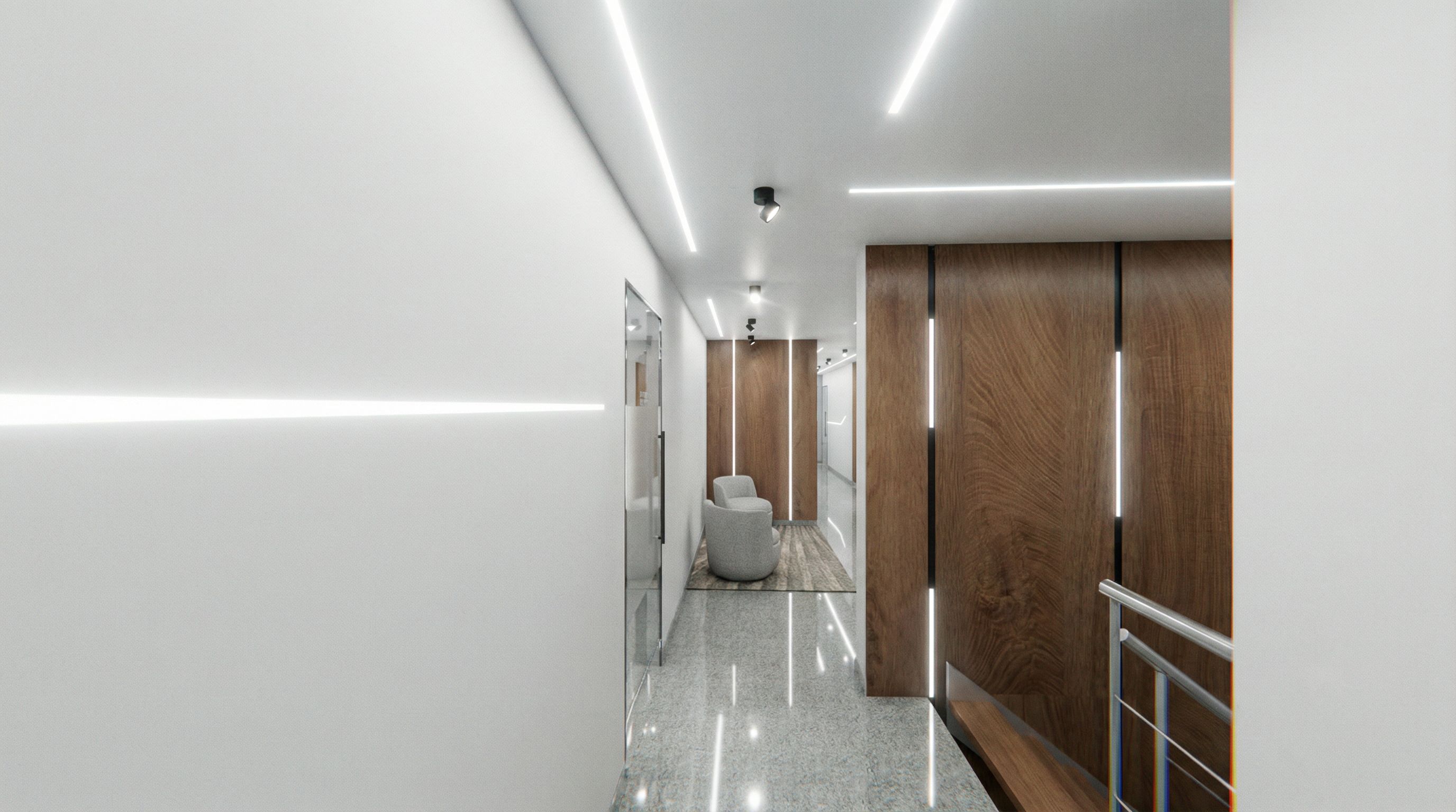 PORFAVOR AÑADE EL EFECTO DE LA ILUMINACION QUE ES BLANCA PORQUE ES UNA CLINICA EL PISO ES COLOR GRANITO GRIS CLARO SE TIENE QUE VER EL BRILLO DEL GRANITO, keep exact camera angle