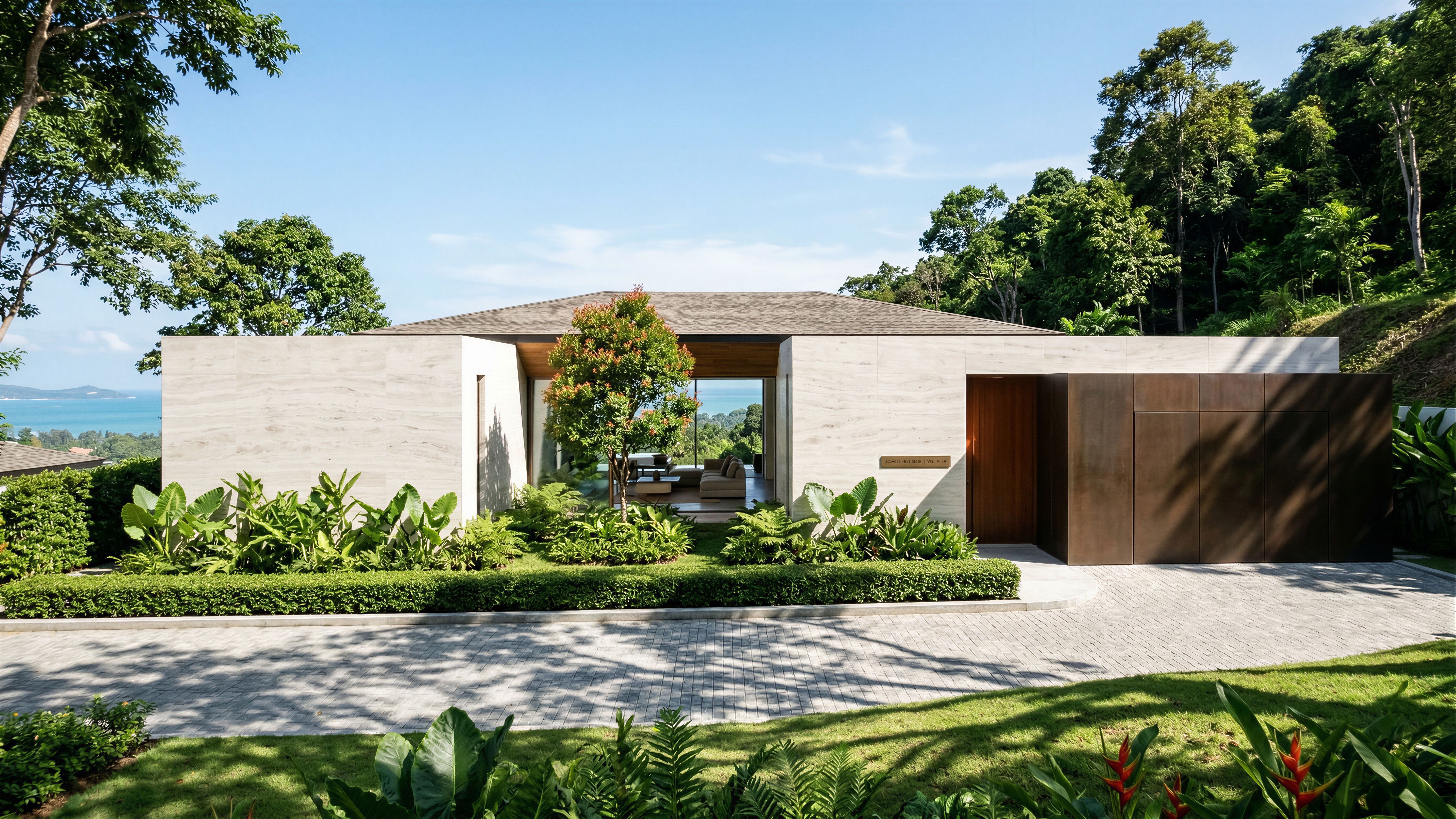 A photorealistic architectural rendering of an ultra-luxury minimal villa in a branded residence on a hillside in Koh Samui. Perspective from the entrance road looking towards the house, with a backdrop of lush treetops and a distant sea view. The facade features a sophisticated blend of White Travertine stone and Bronze, with a warm timber entrance door. A long, manicured hedge and naturall planted tropical plants runs along the front boundary. Between two White Travertine building masses, elegant Syzygium gratum Red Smed tree is featured. The villa uses Vitrocsa sliding window systems with ultra-slim frames, revealing a minimalist living room inside. The roof is finished with asphalt shingles, and a continuous wooden ceiling flows seamlessly from the interior living area to the exterior eaves. The atmosphere is a bright, clear sunny morning with lush tropical greenery and large trees in both the foreground and background and between the villa plots, casting beautiful dappled shadows across the grassy slopes. Note: Absolutely no coconut trees, only native tropical foliage. 8k resolution, cinematic lighting., keep exact camera angle, keep exact camera angle