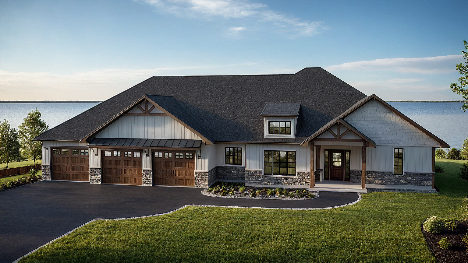 PromptADD A LAKE IN THE BACKGROUND AND LANDSCAPING, LEAVE THE FRONT PORCH WITH A OVERHANG AND ALL THE POSTS, GARAGE DOORS TO HAVE WINDOWS AT THE TOP ONLY, PAVED DRIVEWAY ON THE LEFT HAND SIDE ONLY