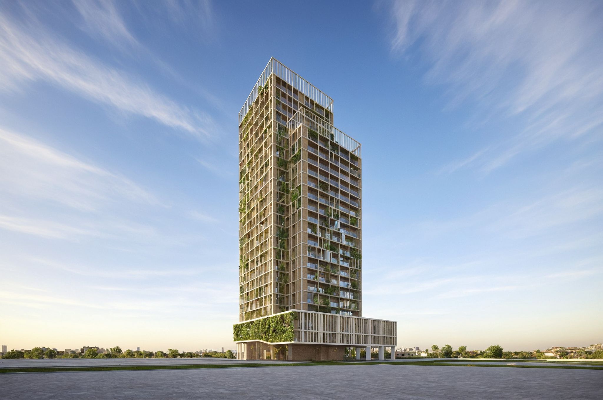 PromptA modern residential building with a strong white structural grid framing multiple levels. The façade combines warm brick walls with large windows and recessed balconies. Each balcony and terrace is filled with lush greenery, climbing plants, and small trees, creating a biophilic design. The structure feels modular and rhythmic, with vegetation softening the geometry. The rooftop integrates trees and a garden, while the lower levels connect seamlessly with the surrounding urban greenery. Photorealistic render, clear daylight, natural shadows, architectural visualization style.