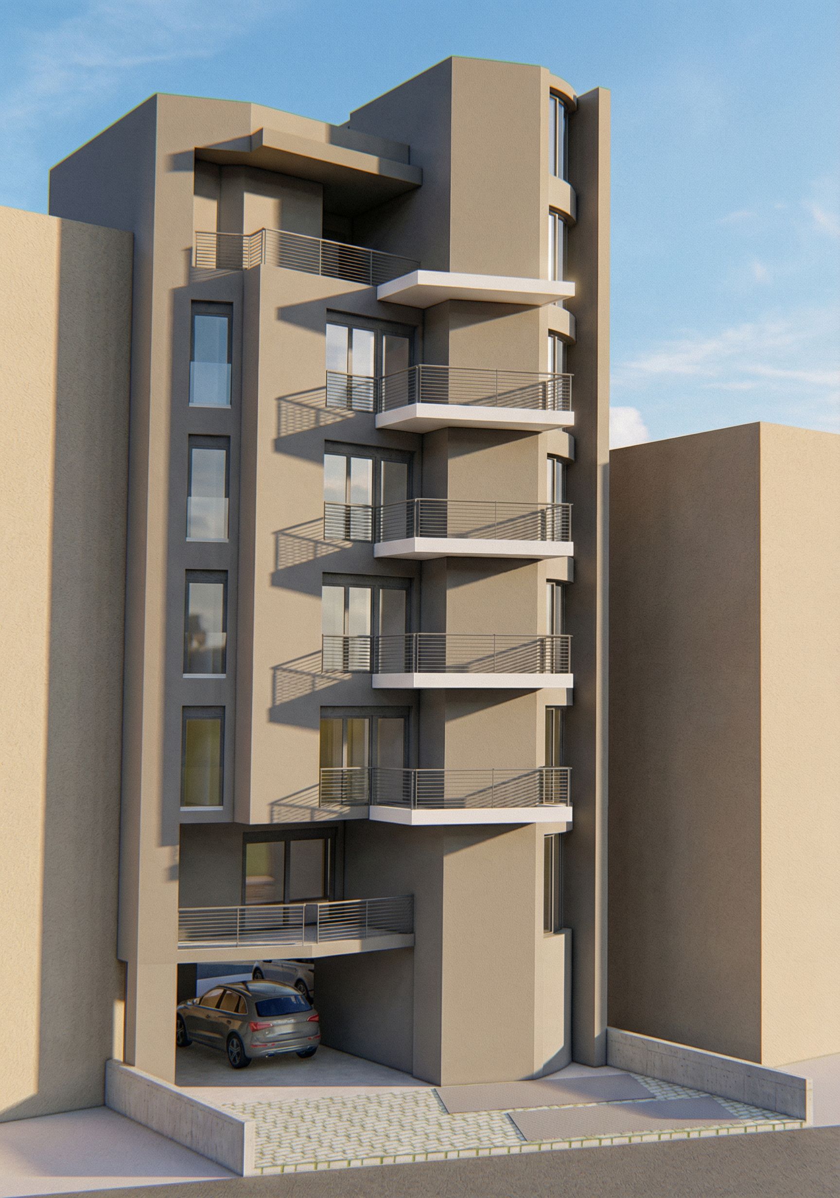 PromptPhoto of a modern apartment building featuring sleek lines and contemporary balconies. Emphasize , expansive glass windows, and white tops of balcony accents. Capture natural sunlight enhancing the architectural details, with soft shadows cast by the balconies. Basic color ral 7006 and some beige details with white balconies. Grey railings. ral 7006 the upper balcony . Dont change the building. Dont change the group of colors, keep exact camera angle