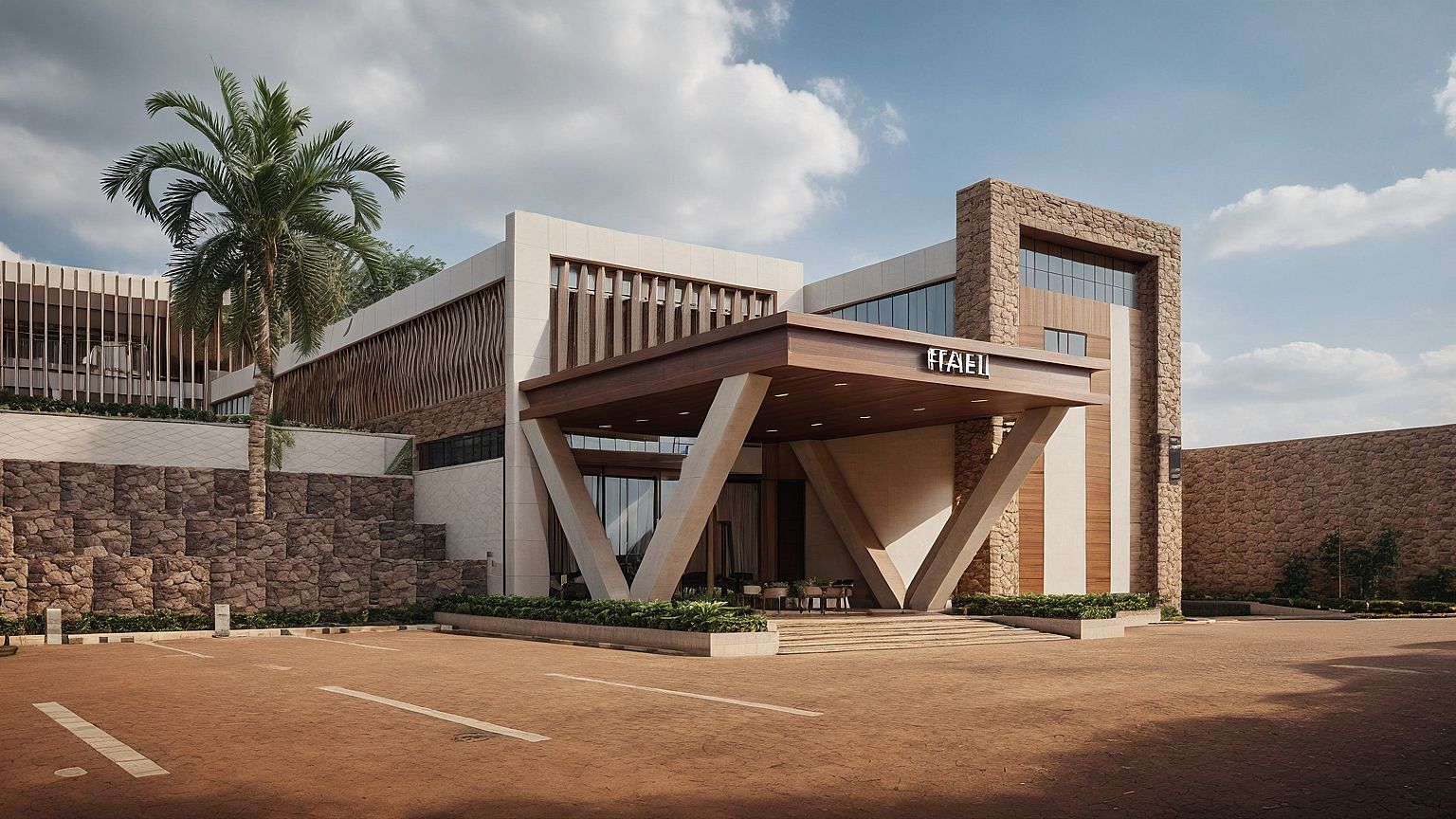 create a high-end image, very tidy around of this new hotel in Kampala context. maintain the image angle. place some people in the context