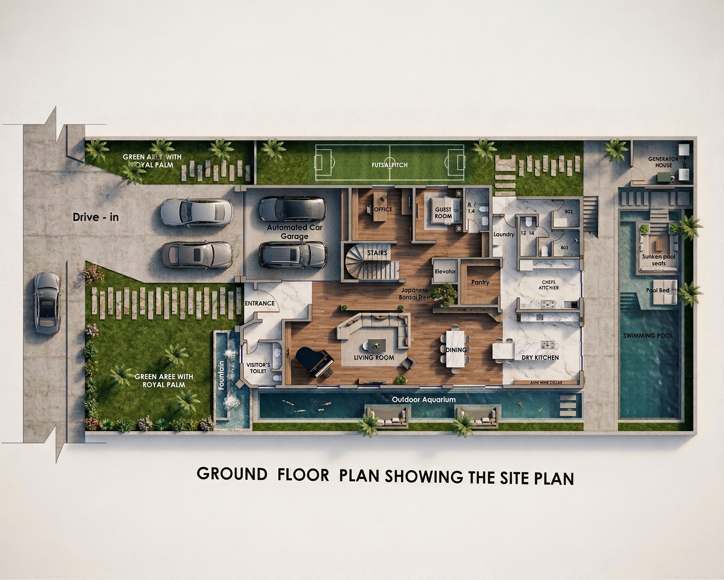 PromptGenerate a high-resolution 2D top-view rendered architectural site plan with ground floor layout of a luxury modern residence. The design should clearly integrate building layout and landscape elements within a single composition. Include the following spaces: Drive-in access and parking area with automated 4-car garage Entrance foyer with visitor’s toilet Spacious living room with piano Dining area connected to dry kitchen Chef’s kitchen with pantry and laundry Office and guest room Staircase and elevator core Mini wine cellar Exterior/site features: Swimming pool with pool deck and lounge beds Sunken pool seating area Outdoor aquarium feature Futsal pitch / recreational court Generator house Green landscape areas with palm trees and lawn Walkways, stepping stones, and driveway paving Style: luxury modern architectural presentation, clean, elegant, and realistic. Apply materials: Interior: wood flooring, marble tiles, neutral tones (beige, white, grey) Exterior: green grass, stone paving, concrete driveway, water textures for pool Include: Fully furnished interior layout Defined walls, doors, and window placements Landscape elements (trees, grass, shrubs) Soft shadows, ambient lighting, and subtle depth Clean orthographic top-down view (no perspective distortion) Minimal, professional labels for key areas Final output should look like a high-end architectural presentation board, sharp, balanced, and visually appealing., keep exact camera angle