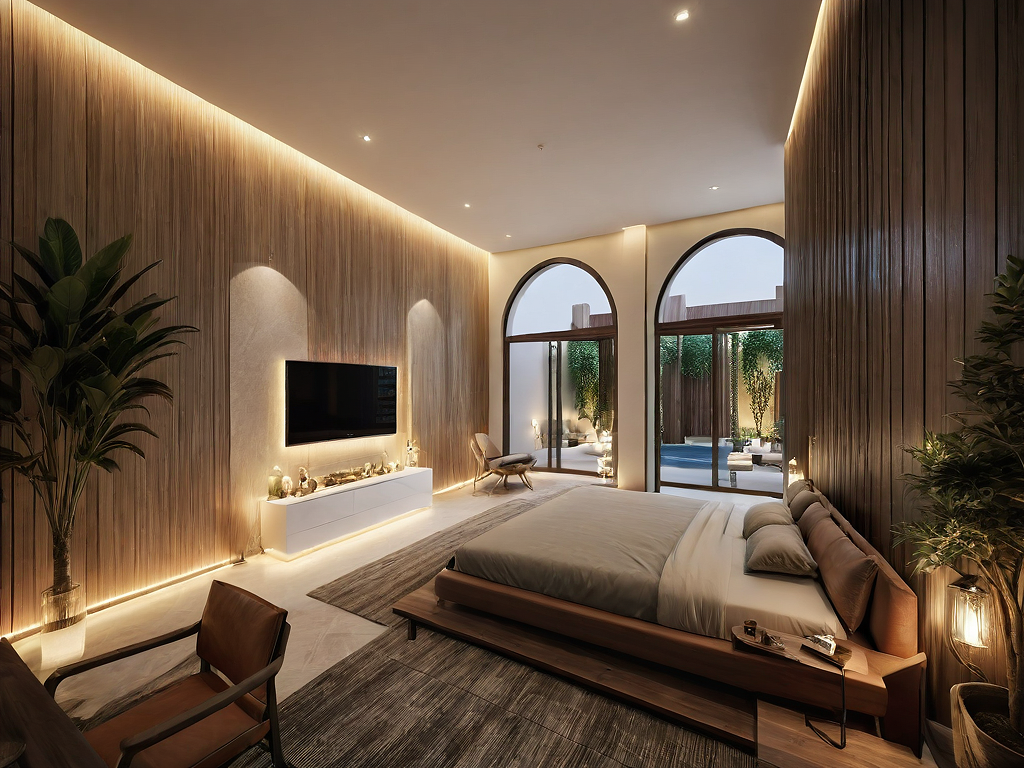 PromptInterior Bedroom with Arabian touch over-viewing external yard. Add plants pots and standing light
