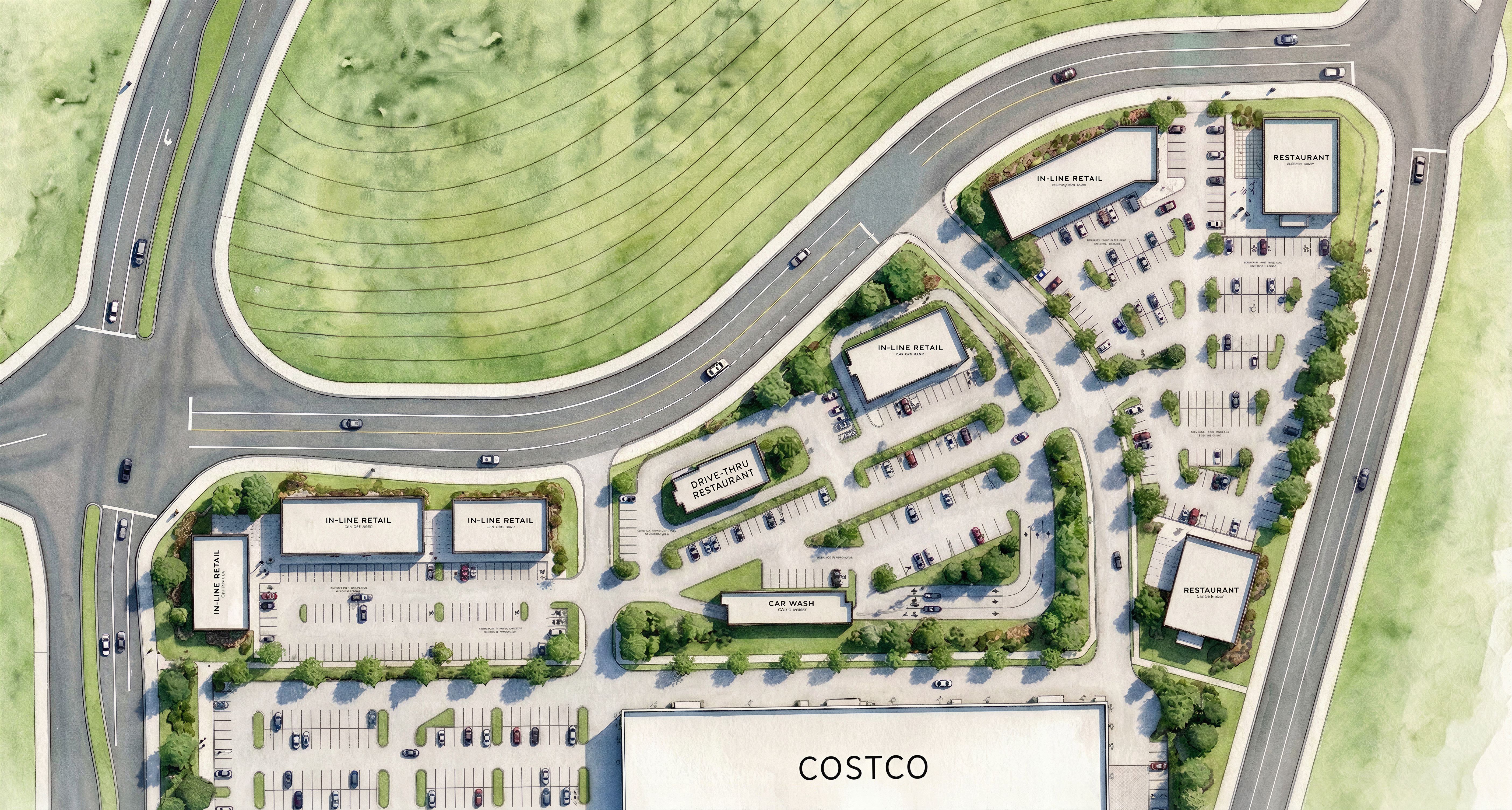PromptDONT CHANGE ANYTHING EXCEPT: CHANGE BIG CAR WASH TEXT TO COSTCO ON SOUTH BUILDING