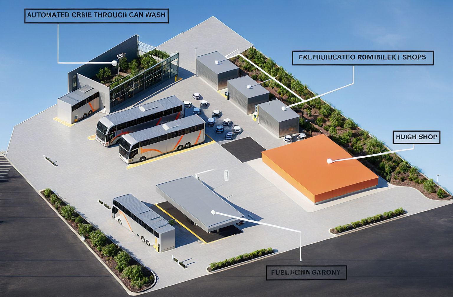PromptPhoto of a modern gas station complex featuring an automated drive-through car wash and prefabricated convenience shops. Highlight the sleek, functional design with glossy materials and vibrant colors. Set in an urban landscape with visible bus lanes and seating areas, surrounded by lush greenery. The scene is bathed in warm, afternoon sunlight, creating dynamic shadows across the paving. Capture a low-angle view to emphasize the height of structures, using a wide-angle lens to include the broader context of the area.