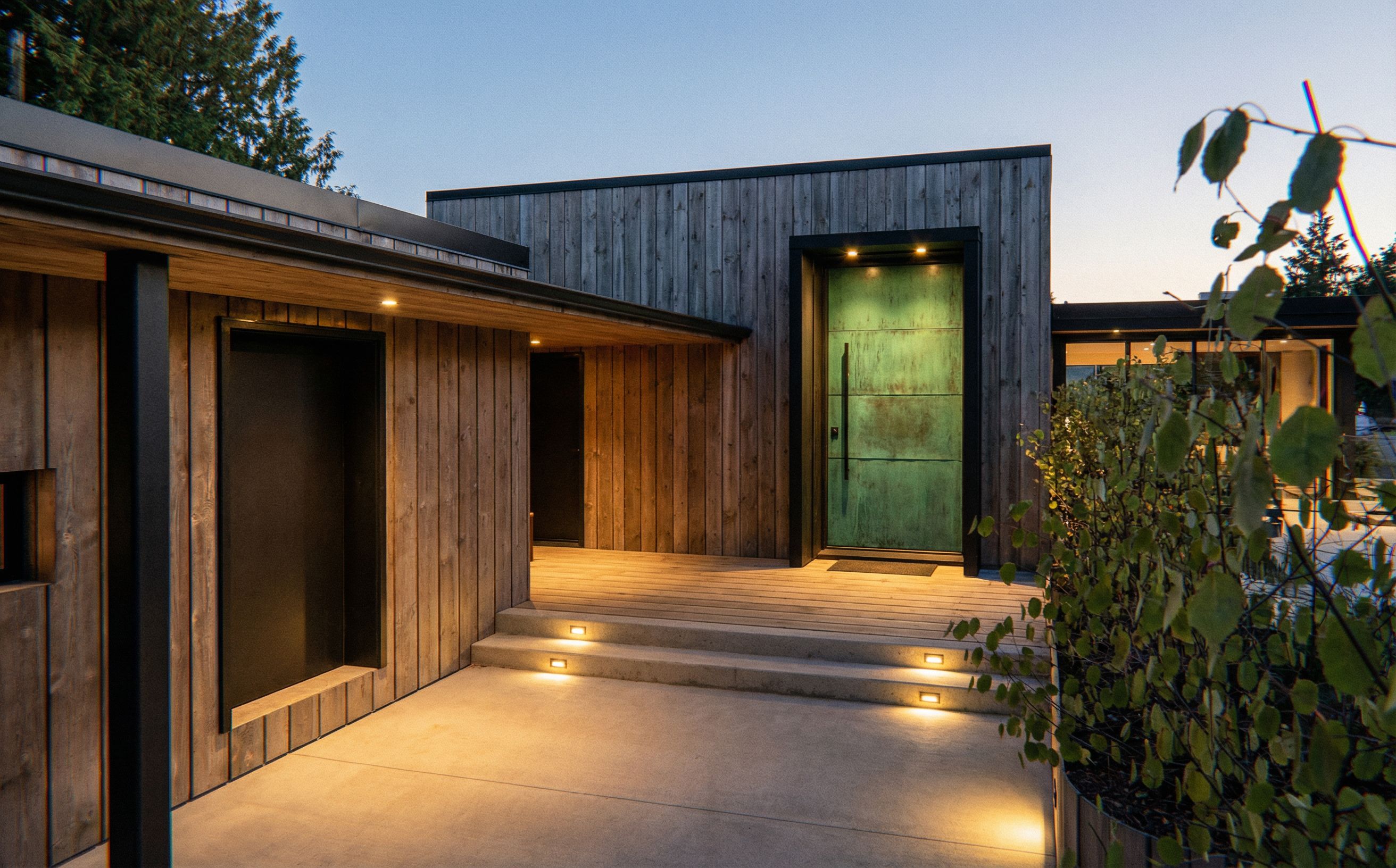 green copper door with black frame. only the door in green copper.. Entrance with led spot lights integrated in the floor on both sides. Spot lights inside top of door frame. Lights leading towards entrance.