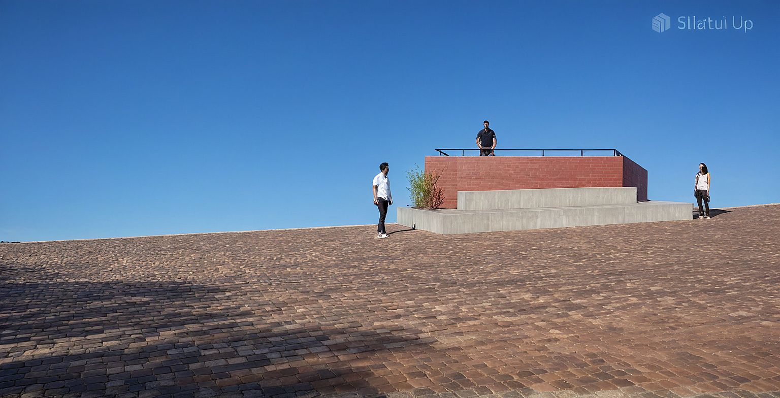 PromptPhoto of a modern architectural platform with tiered levels, featuring a mix of smooth concrete and the wall made of big red sandstone bricks. The surrounding cobblestone pavement adds an earthy touch, complementing the sleek design. Captured during the day with warm sunlight casting gentle shadows, highlighting the textures. A low-angle perspective frames the scene, emphasizing the scale of the structure against a clear sky while capturing the figures engaged in conversation. Black Steel railing on top of platform