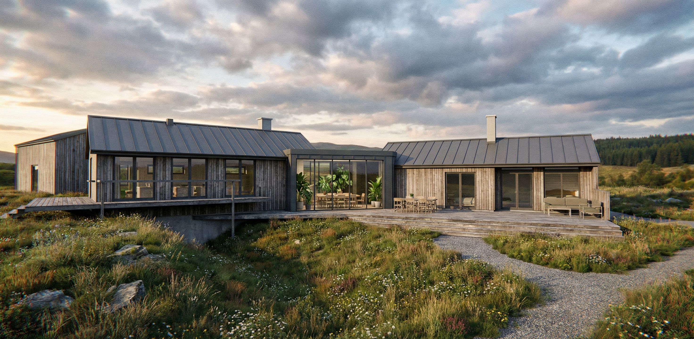 PromptTwo houses with a center connection. The center connection is a combined greenhouse and dining area with double height. , keep exact camera angle