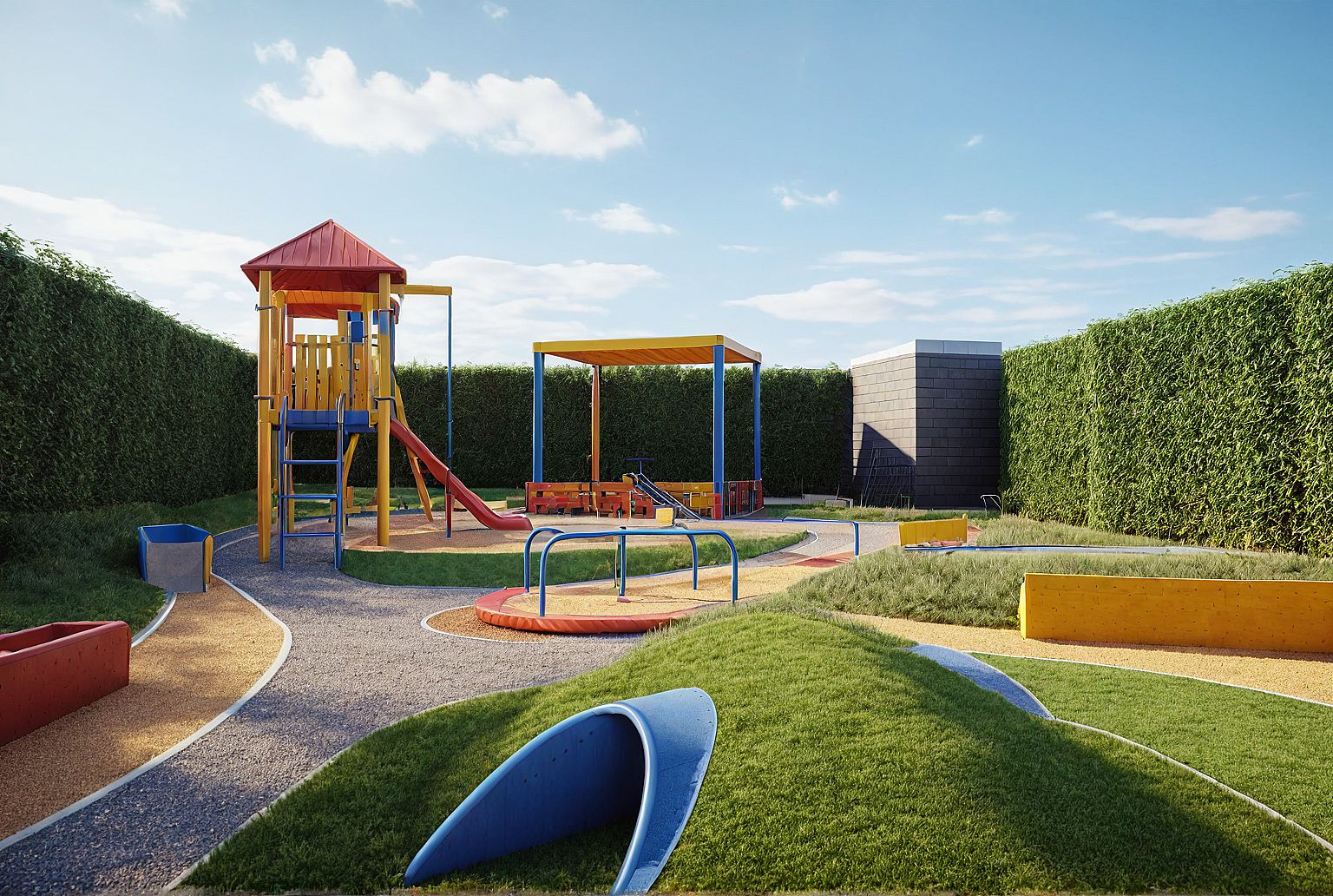 PromptRealistic render of the same children’s playground. Keep all colors and textures the same. Natural daylight, trimmed grass, no people