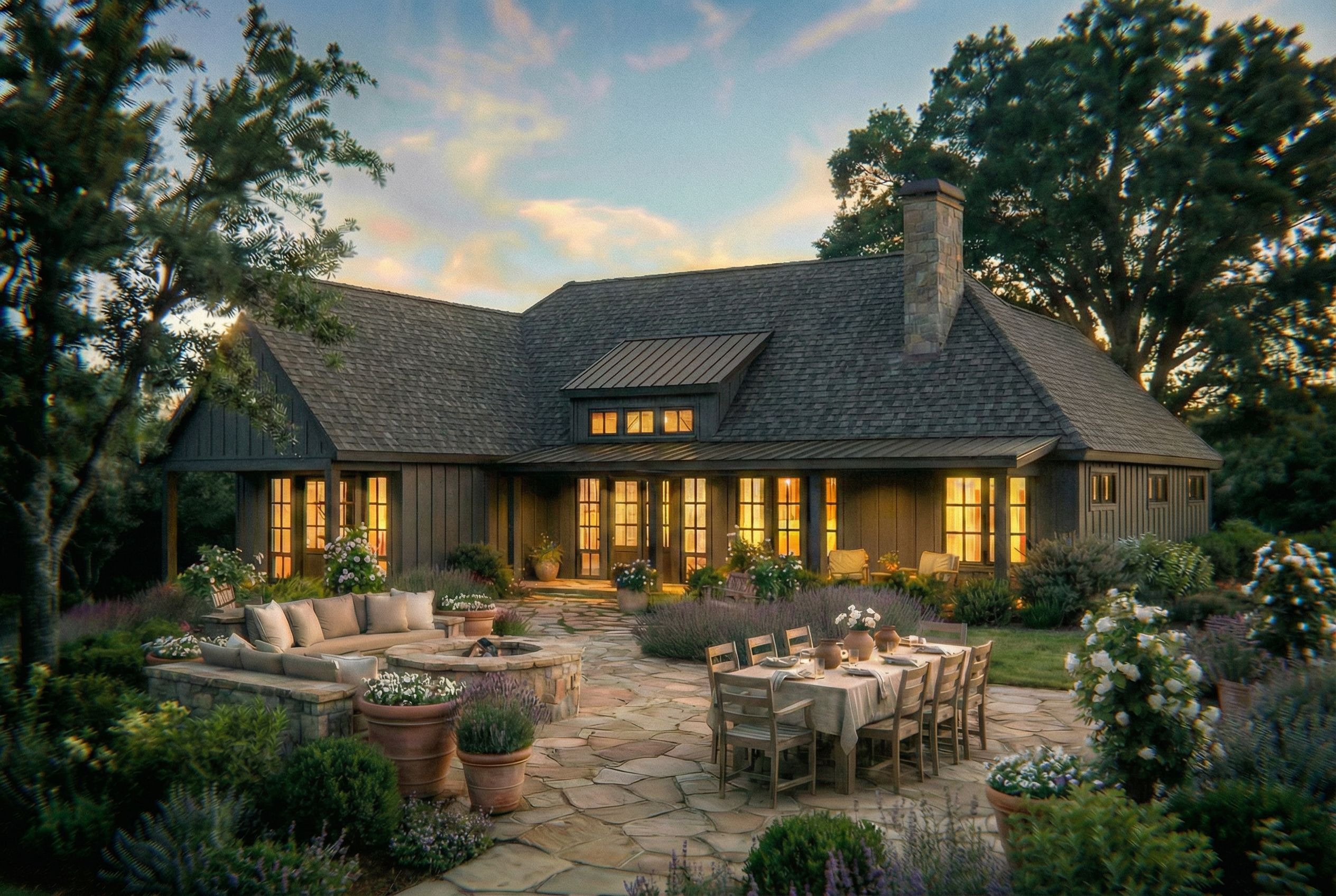 PromptReplace the main roof material to match the dark shingles in the reference image. Leave the dormer roof and the low slope patio cover roof as is (standing seam metal). Leave everything else exactly as it is., keep exact camera angle