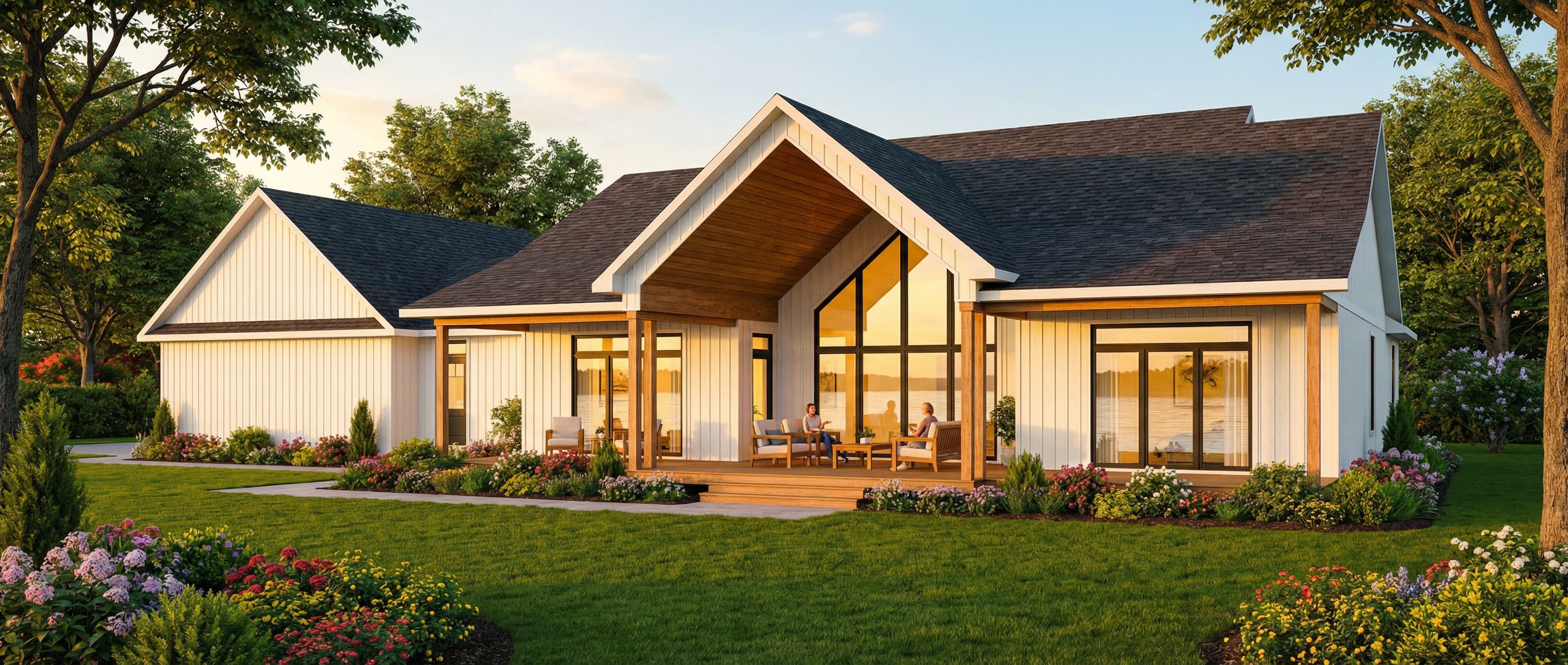 architectural exterior rendering, render this 3D mass into photorealistic rendering, architectural exterior rendering, render this 3D mass into photorealistic rendering, Photo of a modern residential house featuring a pitched roof with a large A-frame window. The building showcases natural wood accents against vertical white siding, creating a harmonious blend of textures. Surrounded by a landscaped yard with vibrant flowers and greenery, the house sits on a serene waterfront. With the lake reflecting in then windows, The warm, golden hour lighting casts soft shadows and emphasizes the house's architectural details. Captured from a low angle to highlight the structure's grandeur, use a wide-angle lens to encapsulate the entire environment and create an inviting atmosphere., keep exact camera angle, golden hour warm lighting, including greenery and vegetation, trees, high quality, professional, detailed scene, keep exact camera angle, golden hour warm lighting, including people, greenery and vegetation, trees, high quality, professional, detailed scene