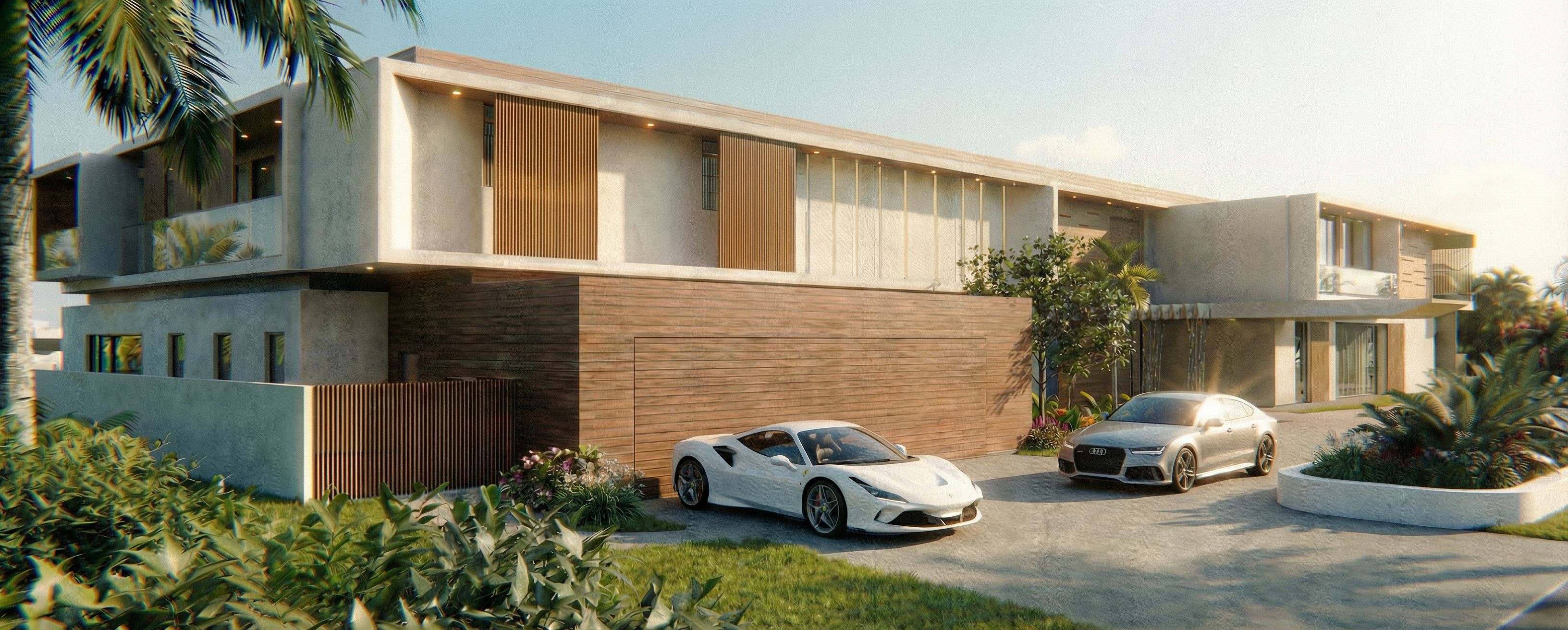 COLOCAR UNA FERRARI F8 BLANCA EN FRENTE AL PORTON DEL GARAGE. QUITAR LA PALMERA ALTA DE LA ENTRADA. COLOCAR UN AUDI RS7 PLATEADO EN EL DRIVE WAY. EL JARDIN DE LA DERECHA DE LA IMAGEN DEBE ESTAR SOBRE UNA JARINERA BLANCA BAJITA REDONDADA EN LA PUNTA , keep exact camera angle